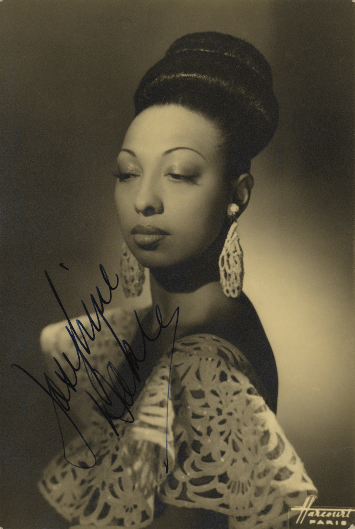 Striking vintage matte-finish 4 x 5.75 photo of Josephine Baker by the Harcourt Studio of Paris, signed nicely in fountain pen. In fine condition, with overall faint silvering. A gorgeous signed portrait and one of the more glamorous examples of Baker that we have offered.