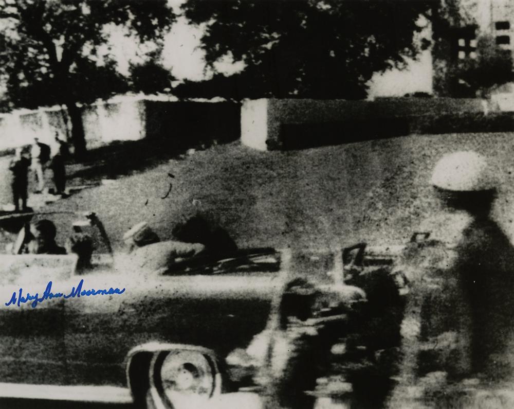 Satin-finish 10 x 8 photo of Mary Ann Moorman's photograph taken just a fraction of a second after the fatal shot of President John F. Kennedy on November 22, 1963, signed in blue felt tip, "Mary Ann Moorman." In very fine condition, with very grainy image quality.