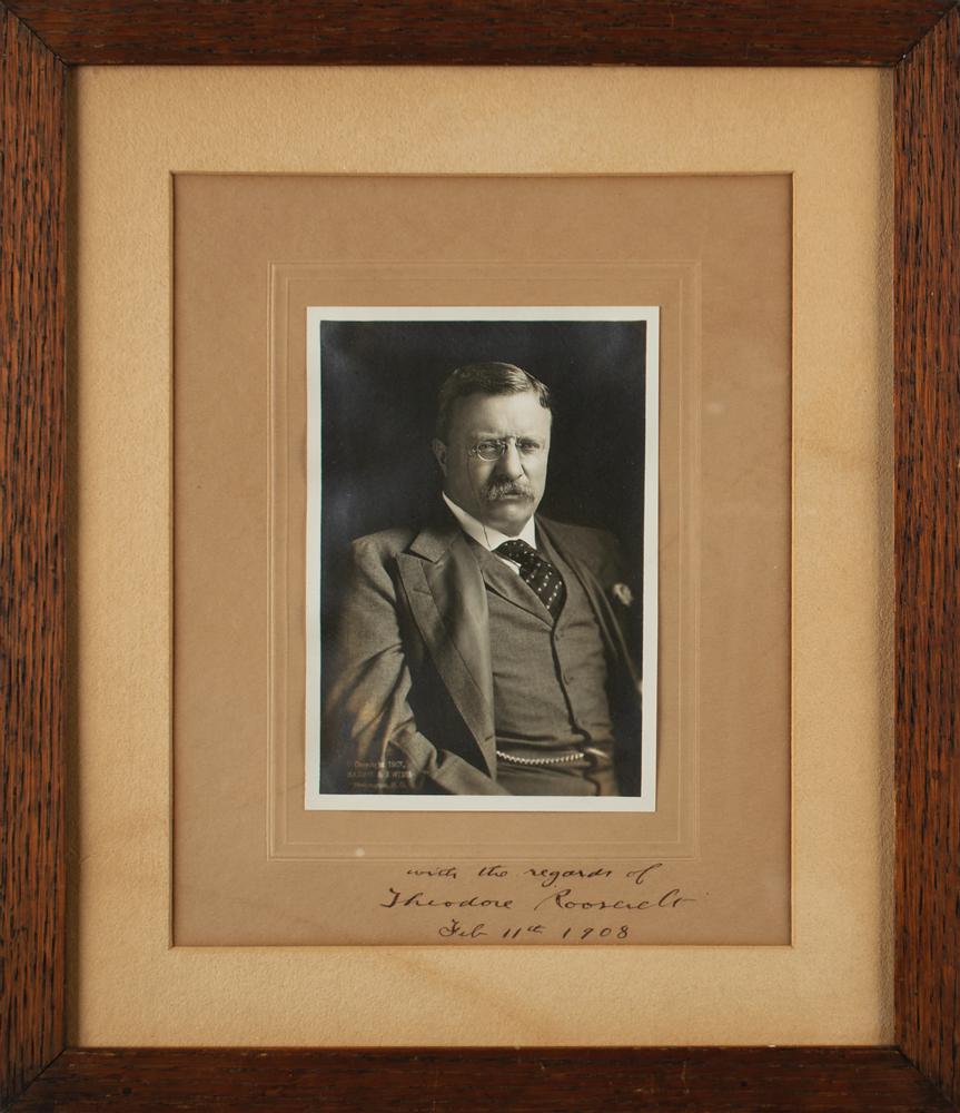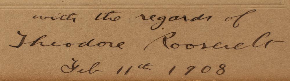 Exquisite vintage matte-finish 4.5 x 6.75 Harris & Ewing portrait of Roosevelt during his White House years, signed on the original studio mount in black ink as president, "with the regards of Theodore Roosevelt, Feb. 11th 1908." Matted and framed to an overall size of 12.75 x 14.75. In very good to fine condition, with dampstaining to the mat and mount, and silvering to the perimeter of the photo. The consignor notes that this portrait originates from the collection of Roger A. Selby, the son of shoe tycoon George D. Selby, who obtained the signature at the Dewey Hotel in Washington, D.C. Accompanied by Roger A. Selby's personal business card.