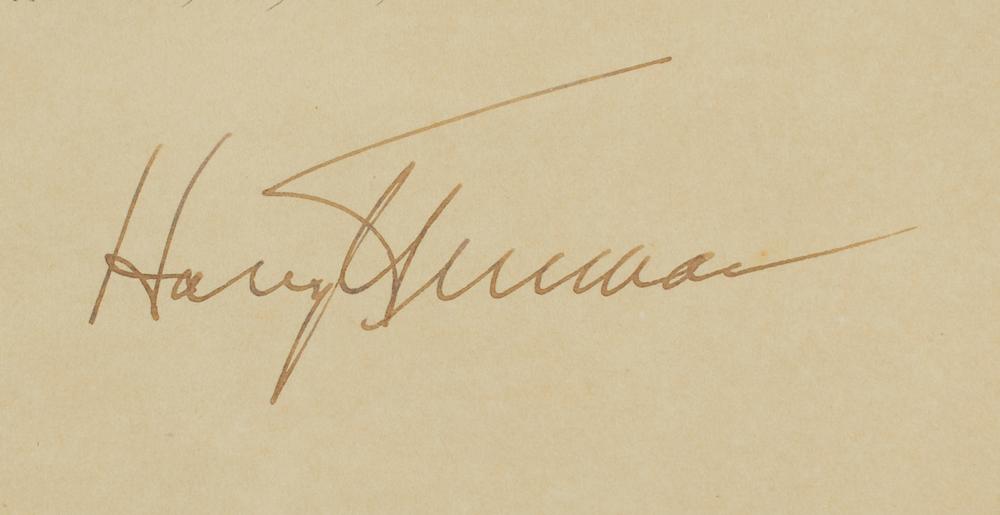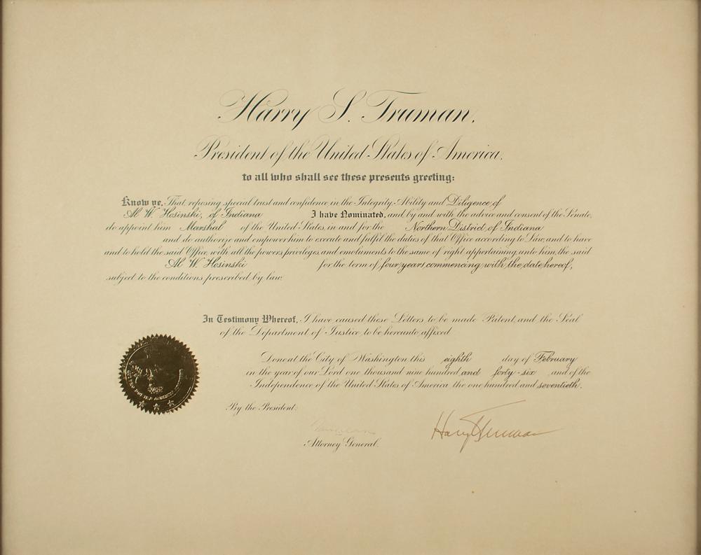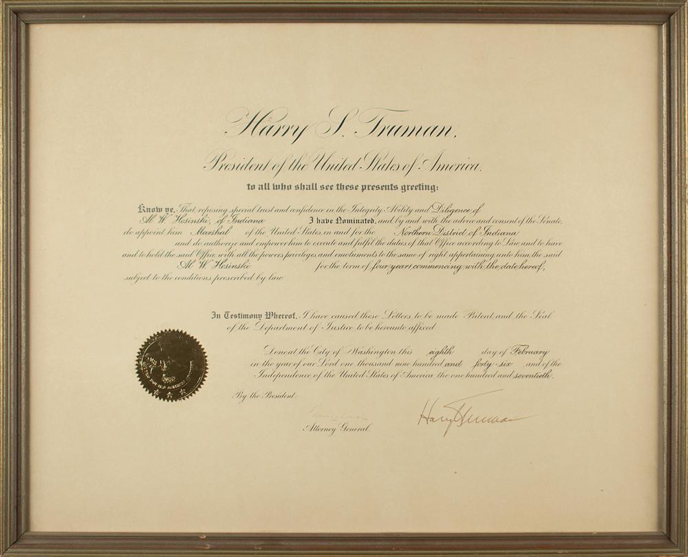 Partly-printed DS as president, one page, 19.5 x 15.75, February 8, 1946. President Truman appoints Al W. Hosinski as a "Marshal of the United States, in and for the Northern District of Indiana." Signed neatly at the conclusion by Harry S. Truman, and countersigned by Attorney General Tom C. Clark, who, when his term was completed in 1949, was nominated by Truman to become an Associate Justice of the Supreme Court of the United States. The lower left retains the bright gold foil Justice Department seal. Framed and in fine condition, with heavy fading to Clark's signature.