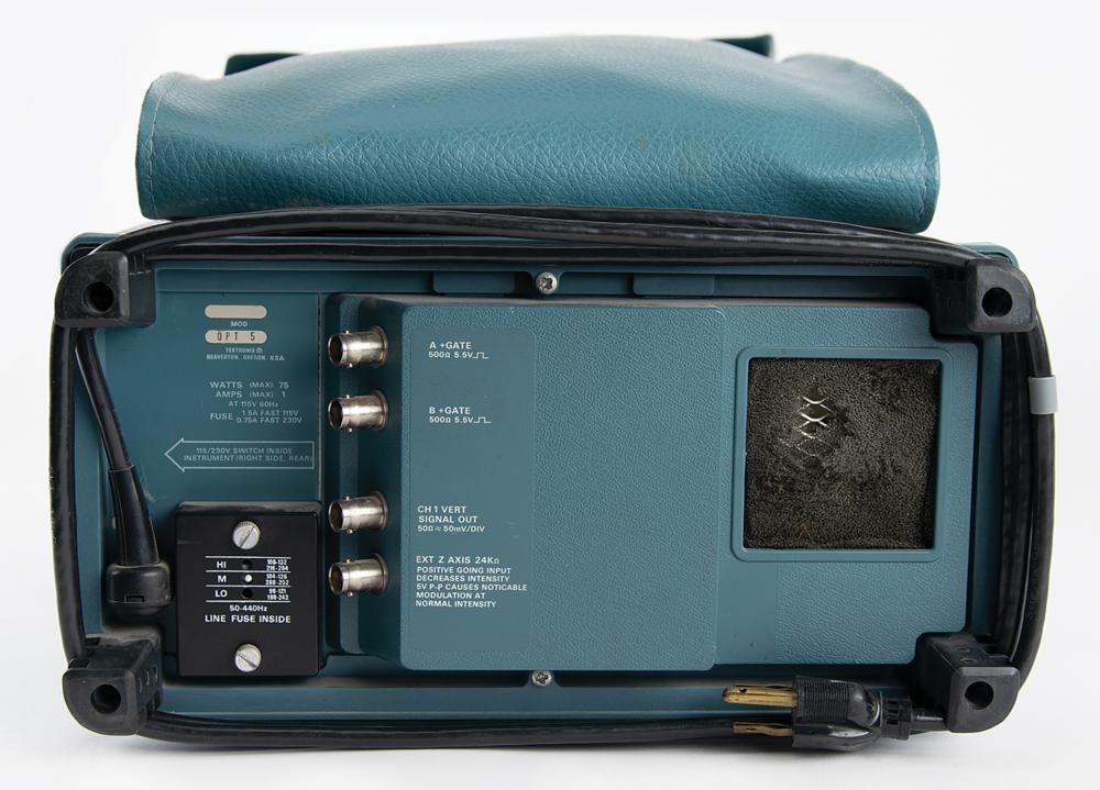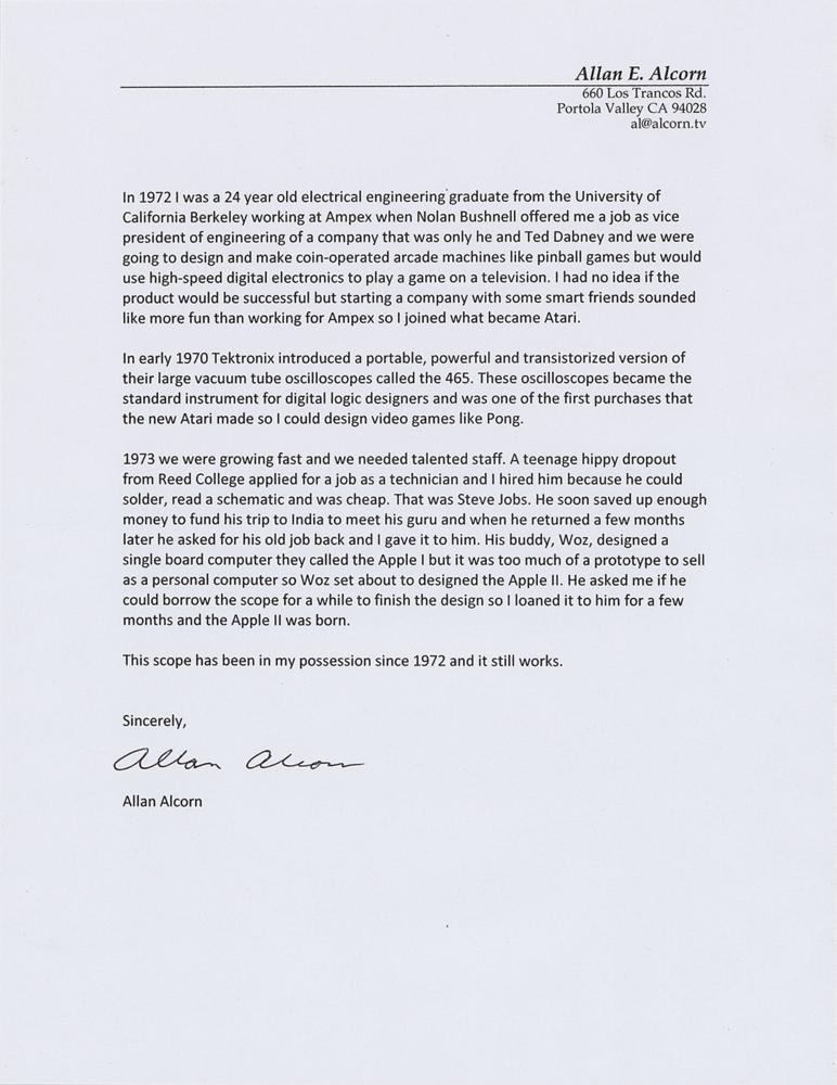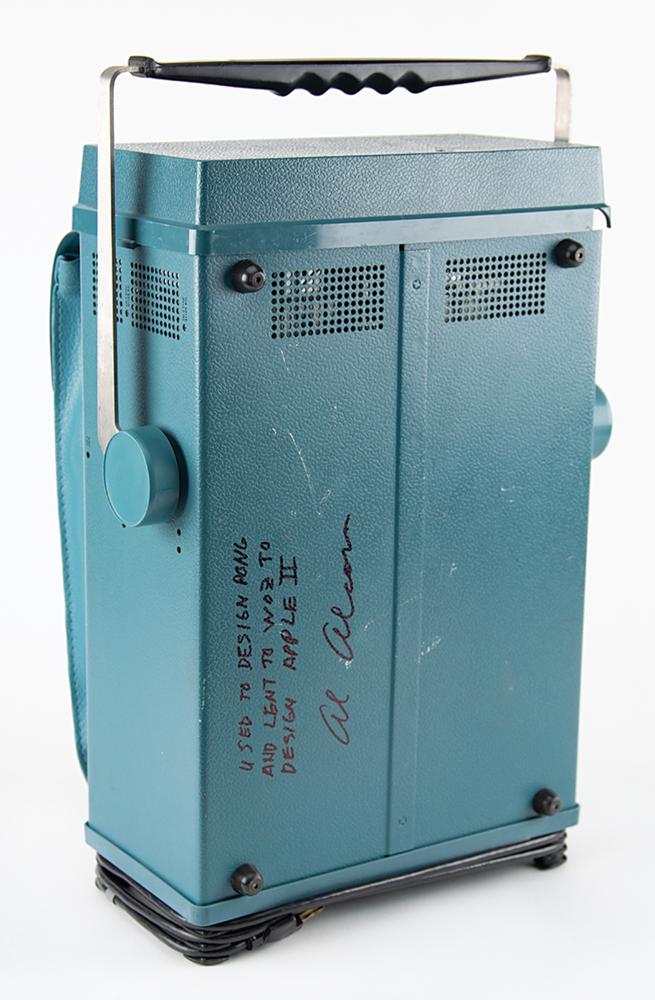 Atari engineer Al Alcorn’s Tektronix 465 Dual-Trace 100 MHz Oscilloscope that he used to create the early video game Pong and that he later lent to Apple Computer founder and lead designer Steve Wozniak, who used the machine to develop the Apple II 8-bit home computer. The Tektronix 465 is signed on the bottom in black felt tip, “Used to design Pong and lent to Woz to design Apple II, Al Alcorn.” The lab standard of the 1980s and one of the most popular scopes ever produced, the Tektronix 465 is a wide-band, portable oscilloscope with external or internal triggers, calibrator, delayed triggered sweep, and much more. The dual-channel dc-to-100 megahertz vertical deflection system provides calibrated deflection factors from 5 millivolts to 5 volts/division, and the bandwidth limiting switch reduces inference from signals above about 20 megahertz for viewing low-frequency, low-level signals. Includes the original instruction manual. Untested and in fine cosmetic condition, with a chip to the edge of the display cover, and wear to foam on the back vent.