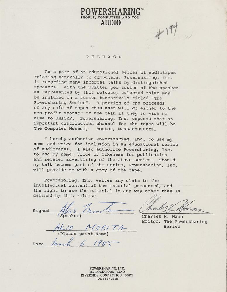 Japanese physicist and businessman (1921-1999) who co-founded the Sony Corporation. DS, one page, 8.5 x 11, March 6, 1985. Morita consents to the release of a talk given as part of a Harvard IT series on March 6, 1985, as part of Charles Mann's "series tentatively titled 'The Powersharing Series.'" Morita's talk included reflections on American vs. Japanese culture and business philosophy. Signed at the conclusion in ballpoint by Morita, printing his name and writing the date below. Countersigned in ink by Mann. In fine condition.