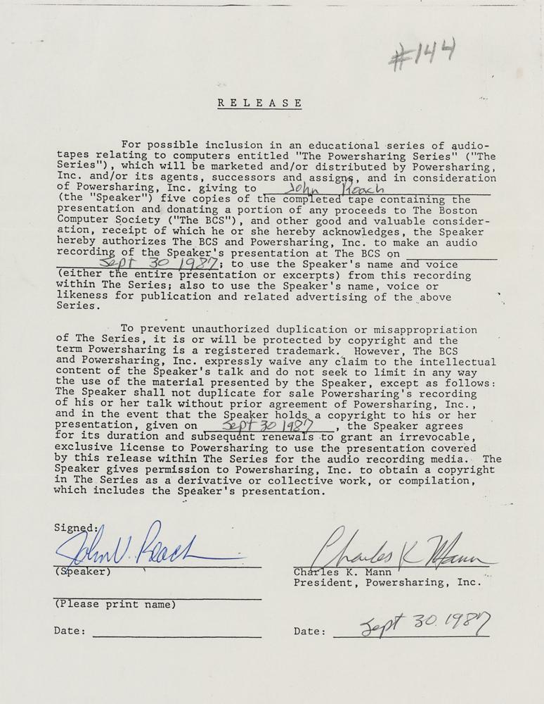 Personal computing pioneer (1938-2022) who, while working for Tandy Corporation, introduced the fully assembled TRS-80, which quickly became the best-selling personal computer on the market. Roach hired Bill Gates and Paul Allen, the future founders of Microsoft, to write the software for the TRS-80. DS, signed “John V. Roach,” one page, 8.5 x 11, September 30, 1987. Roach consents to the release of his lecture, 'Tandy's Challenge to IBM,' given before the Boston Computer Society on September 30, 1987, as part of Charles Mann's "educational series of audiotapes relating to computers entitled 'The Powersharing Series.'" Signed at the conclusion in blue ballpoint by Roach, and countersigned in black ballpoint by Mann. In fine condition.