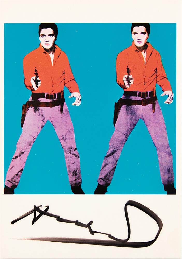 Very desirable color semi-glossy 4 x 5.75 postcard of Andy Warhol’s 1964 work ‘Elvis I,’ which shows side-by-side images of Presley dressed as a cowboy gun-in-hand for a publicity shot from the 1960 film Flaming Star, signed nicely in the lower border in black felt tip by Warhol. In very fine condition.