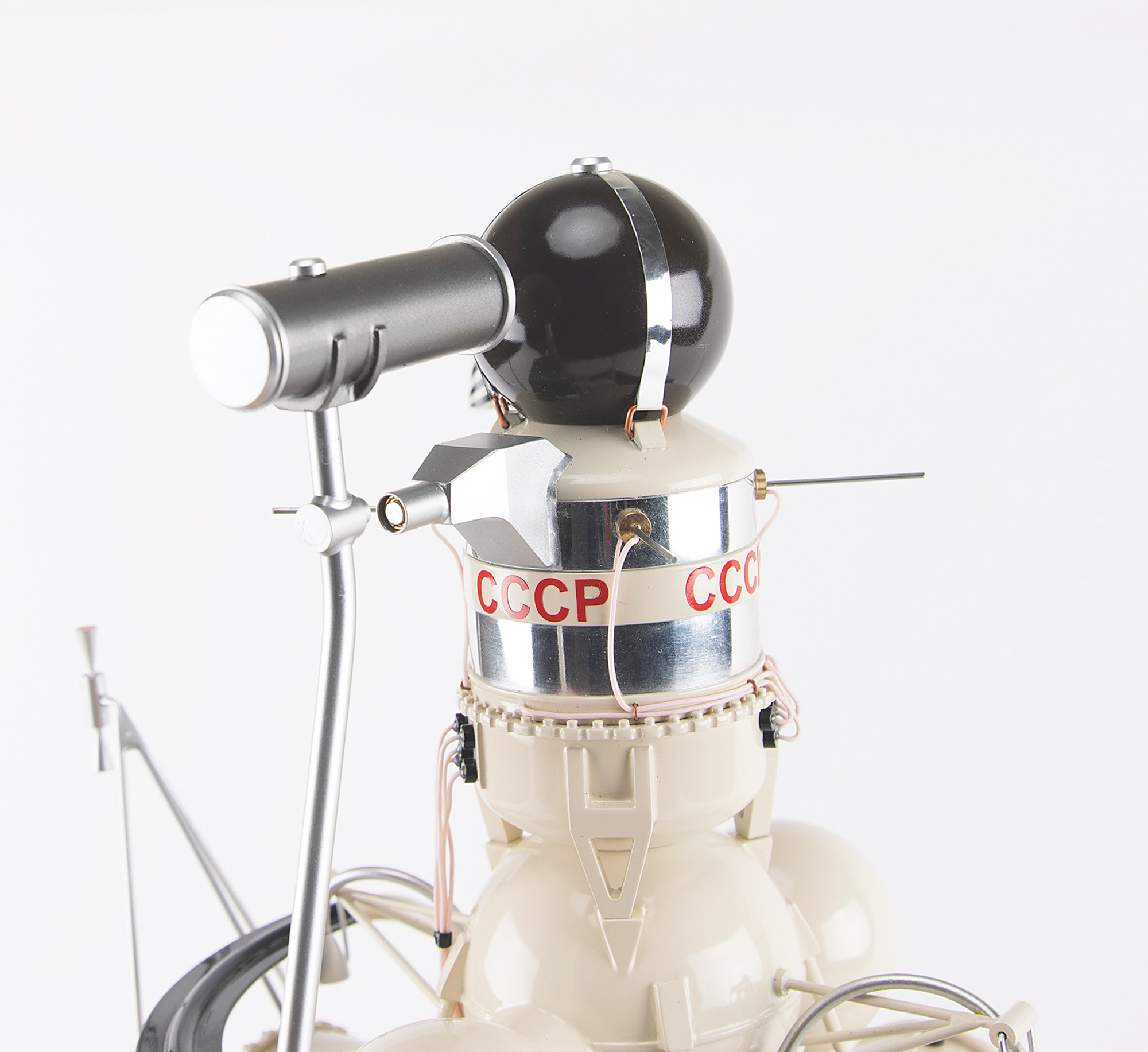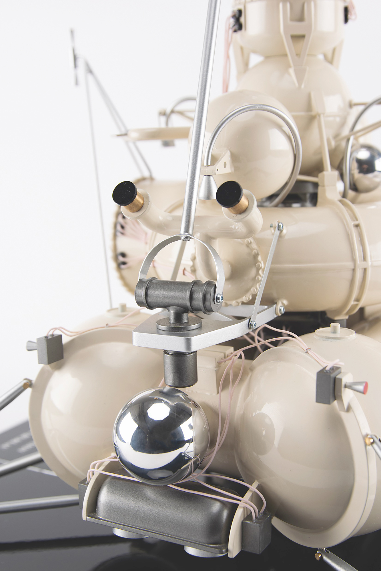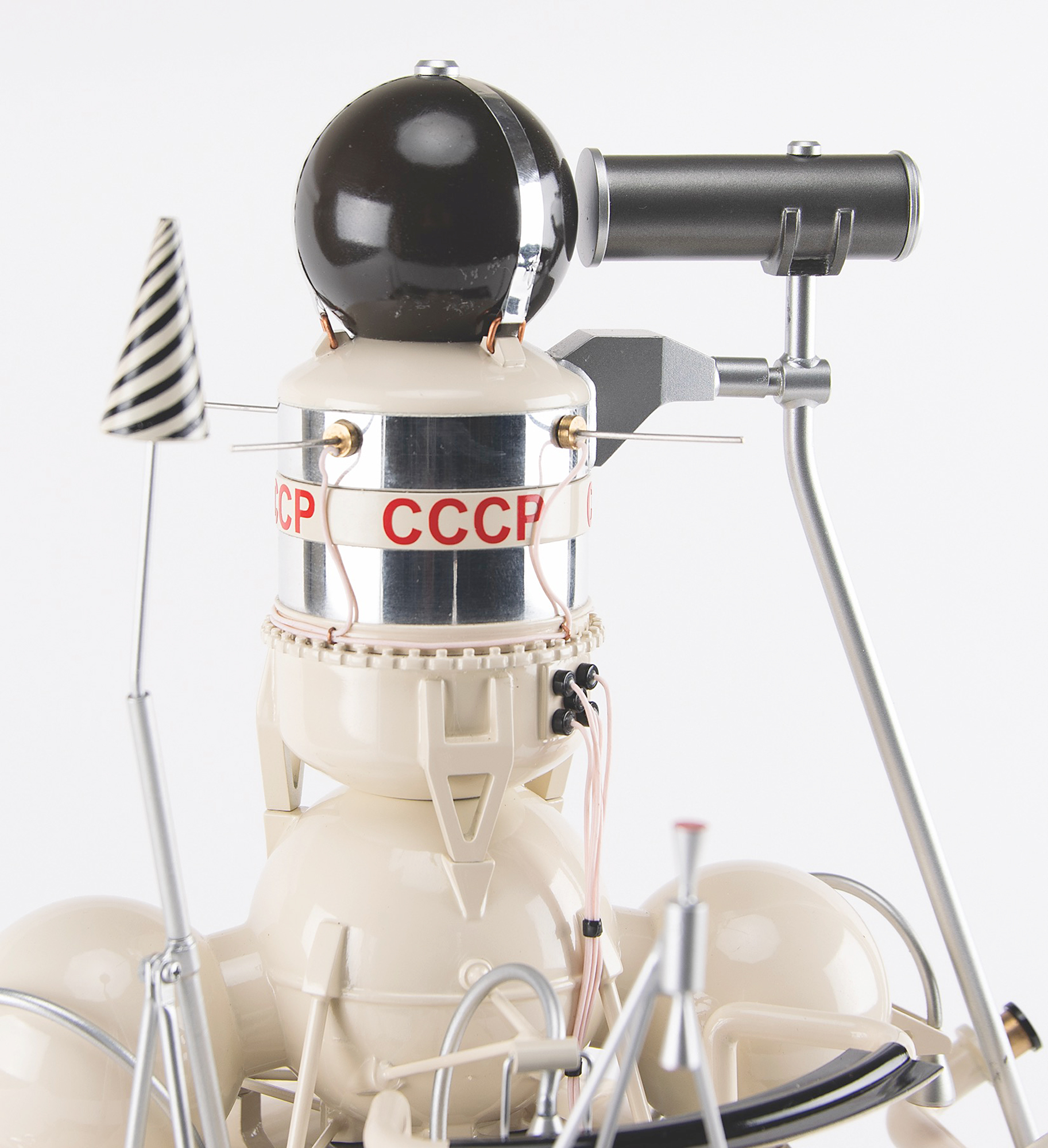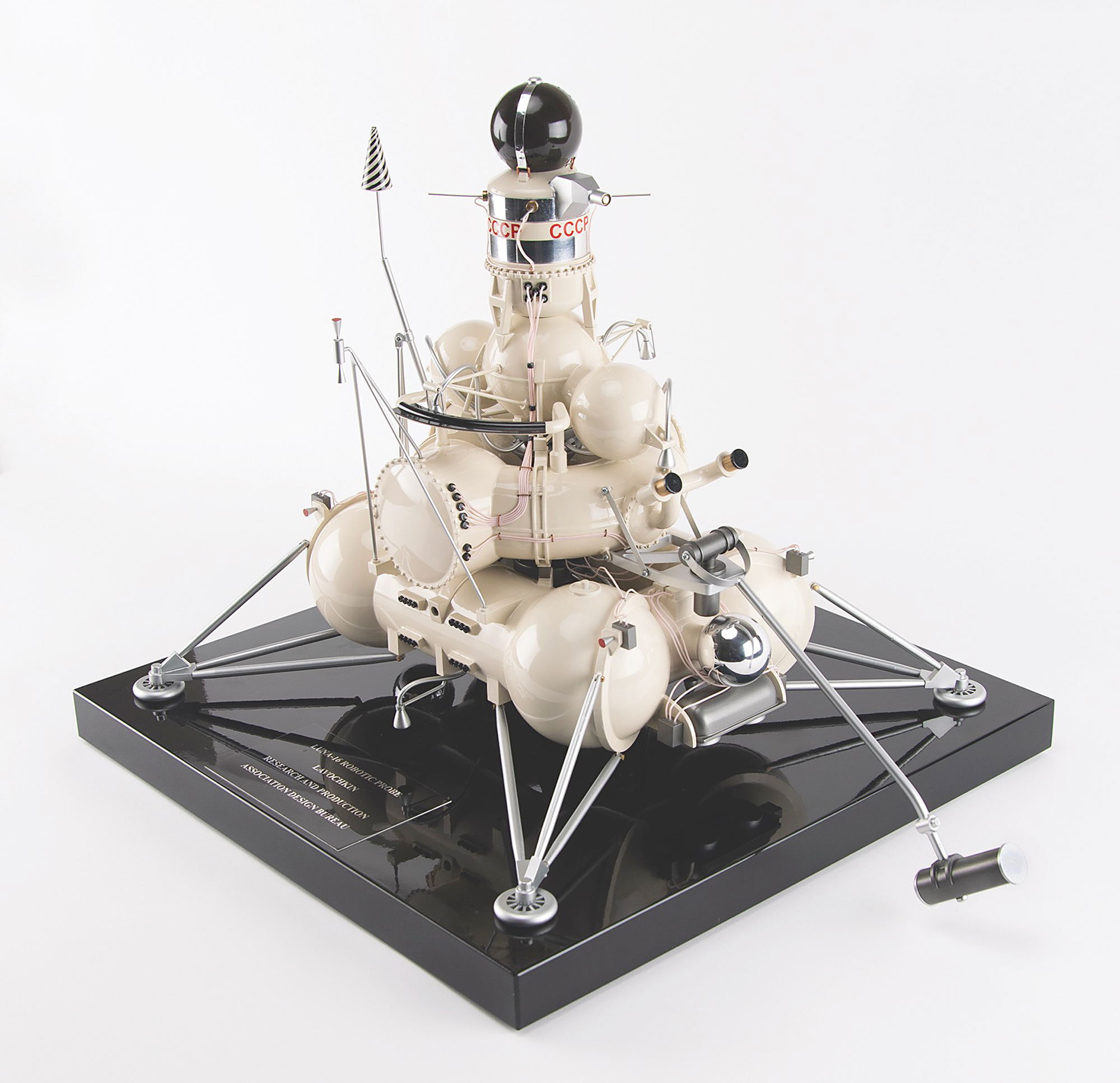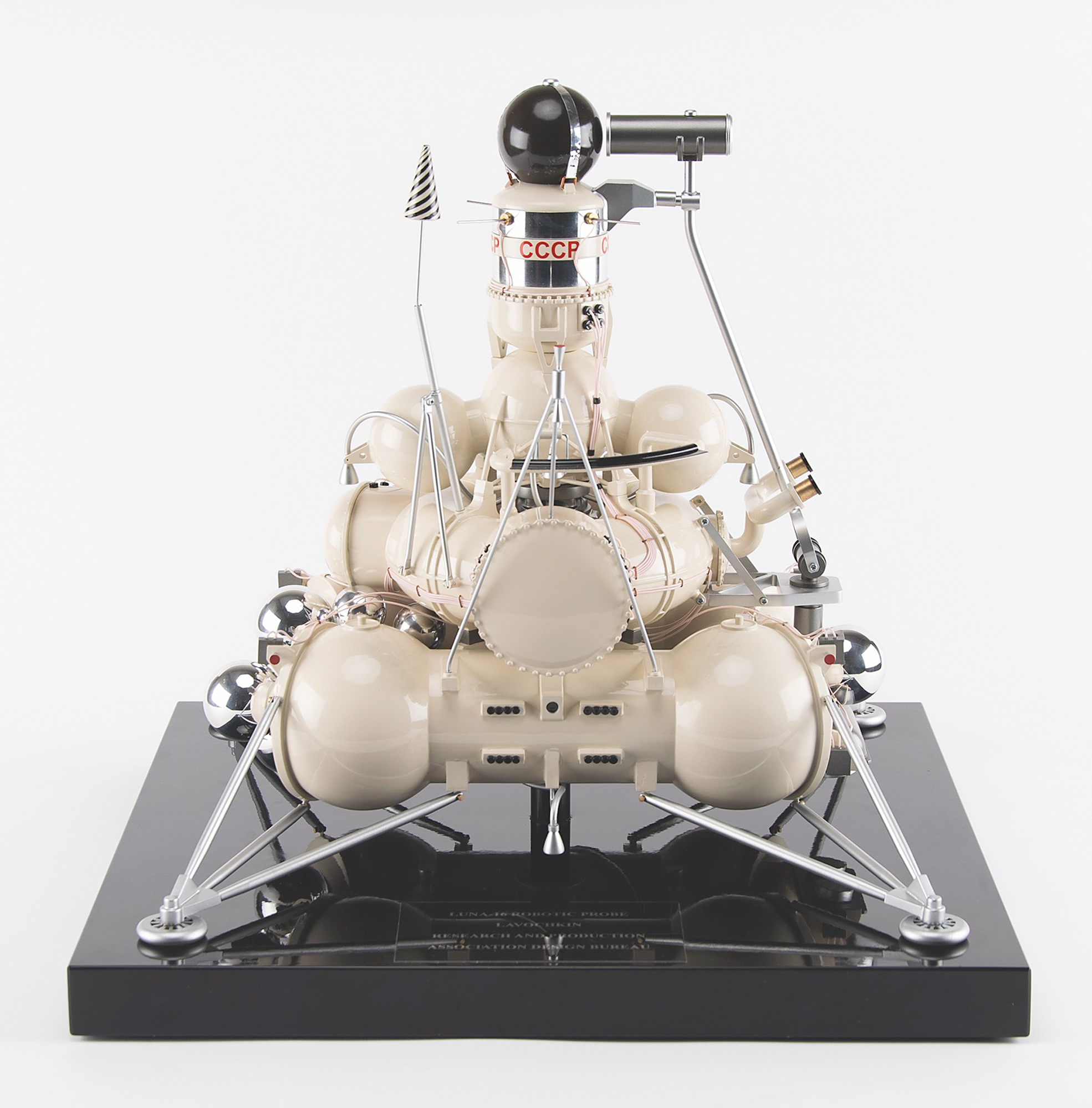 The spacecraft consisted of an ascent stage mounted on top of a descent stage. Portrayed here in tremendous detail, the lower descent stage featured a cylindrical body with four protruding landing legs, fuel tanks, a landing radar, and a dual descent engine complex, and was equipped with a television camera, radiation and temperature monitors, telecommunications equipment, and an extendable arm with a drilling rig for the collection of a lunar soil sample. The ascent stage was a cylinder with a rounded top and carried a hermetically sealed soil sample container inside a re-entry capsule. The probe launched on September 12, 1970, entered lunar orbit, and then landed on the surface on September 20. It collected a sample of lunar soil and returned to Earth on September 24, becoming the first successful robotic probe to land on the lunar surface. A meticulously crafted model representing this historic automated lunar mission.