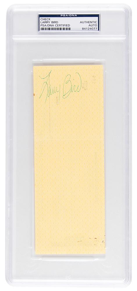 Trinity Independent Church check, 8.25 x 3, filled out and signed by a reverend, payable to "Larry Bird of the Boston Celtics" for $0.25, December 3, 1981, appropriately endorsed on the reverse in green ballpoint, "Larry Bird." The memo field notes that the minuscule payment is for his "Autograph." In fine condition. Encapsulated in a PSA/DNA authentication holder.