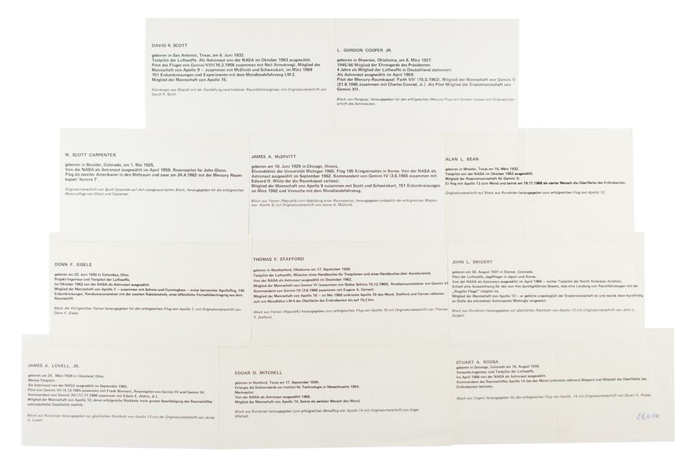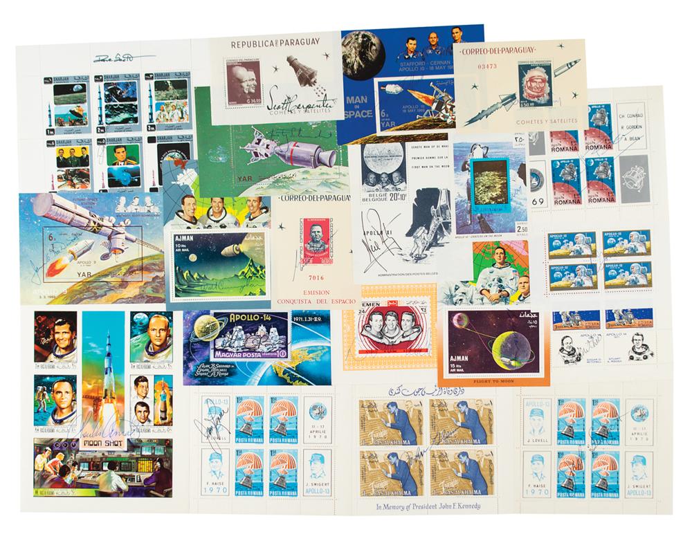 Sought-after complete set of 20 international stamp sheets signed between 1968 and 1971 for German stamp dealer Hermann E. Sieger. The collection consists of commemorative postage stamps from around the world, each signed in various ink types by an Apollo or Mercury-era astronaut, including: Neil Armstrong (Belgium), Stuart Roosa (Hungary), Richard Gordon (Hungary), Gene Cernan (United Arab Emirates), Rusty Schweickart (Yemen), Edgar Mitchell (Romania), Alan Bean (Romania), James Lovell (Romania), Scott Carpenter (Paraguay), Frank Borman (United Arab Emirates), Wally Schirra (Paraguay), Don Eisele (Yemen), Gordon Cooper (Paraguay), John Glenn (United Arab Emirates), Walt Cunningham (United Arab Emirates), Jack Swigert (Romania), Tom Stafford (Yemen), Jim McDivitt (Yemen), Charles Conrad (United Arab Emirates), and Dave Scott (United Arab Emirates). In overall fine condition. Accompanied by a full letter of authenticity from Zarelli Space Authentication for the Conrad signed stamp, and by 11 of the original German-language biography cards.
