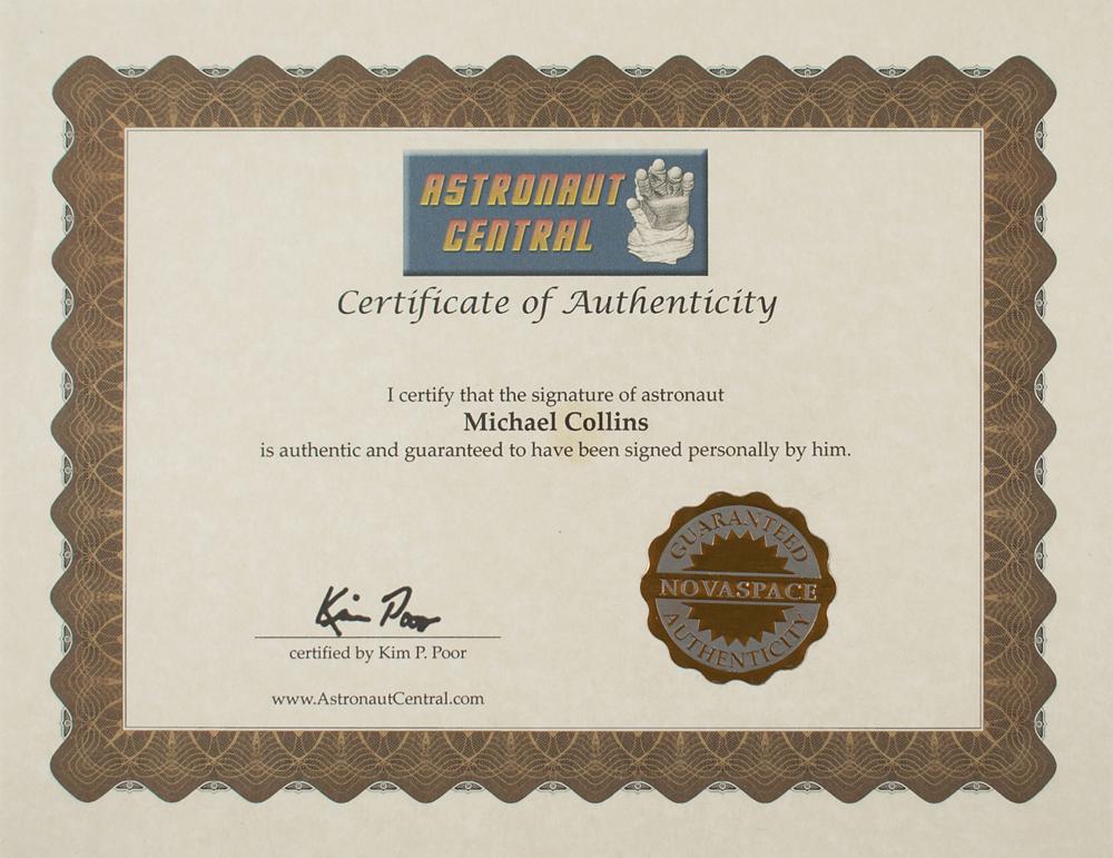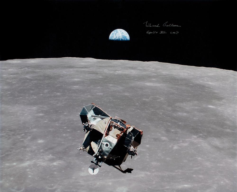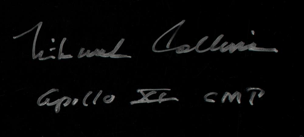 Color satin-finish 20 x 16 photo of the Lunar Module Eagle high above the lunar surface with the Earth visible in the background, signed in silver ink, "Michael Collins, Apollo XI CMP." In fine condition, with a few small surface creases, and adhesive remnants to corners. Accompanied by a certificate of authenticity from Astronaut Central.