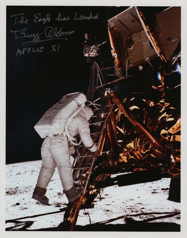 Color satin-finish 8 x 10 photo of LMP Buzz Aldrin descending the Lunar Module ladder during Apollo 11's historic EVA, signed in silver ink, "The Eagle has landed, Buzz Aldrin, Apollo XI." In very fine condition.