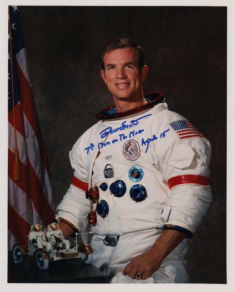 Color semi-glossy 8 x 10 photo of moonwalker Dave Scott posing in his white space suit next to an American flag and a small model of the lunar rover, signed in blue felt tip, "Dave Scott, 7th man on the moon, Apollo 15." In very fine condition. A desirable example due to Scott's addition of his historic lunar-landing feat.