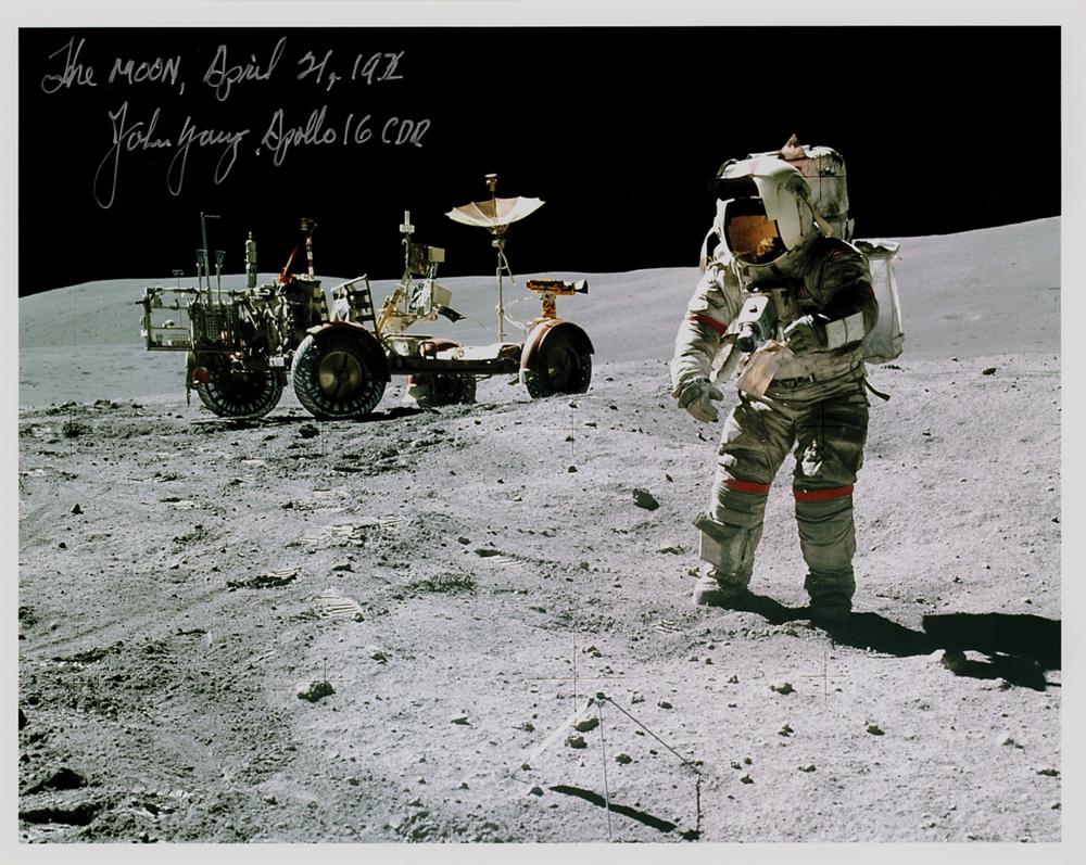 Uncommon color satin-finish 10 x 8 full-length photo of John Young standing near the lunar rover during an Apollo 16 EVA, signed in silver ink, "The Moon, April 21, 1972, John Young, Apollo 16 CDR." In very fine condition.