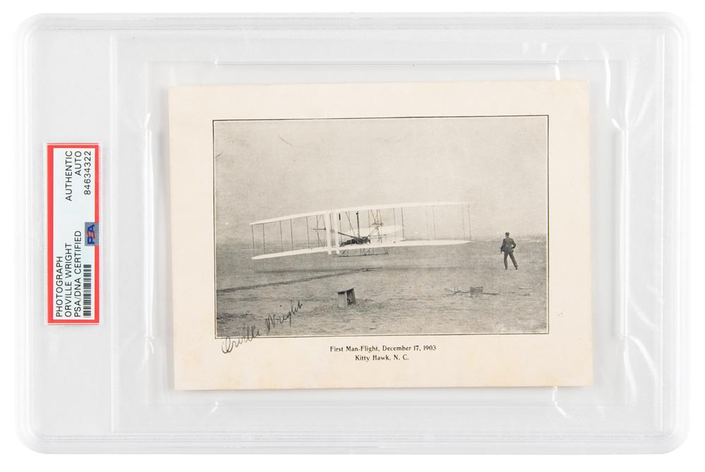 Iconic 6.25 x 4.5 cardstock photo of the Wright Brothers’ first flight, captioned at the bottom "First Man-Flight, December 17, 1903, Kitty Hawk, N. C.," signed in the lower left in fountain pen by Orville Wright. In fine condition, with light staining to the bottom. Encapsulated in a PSA/DNA authentication holder.