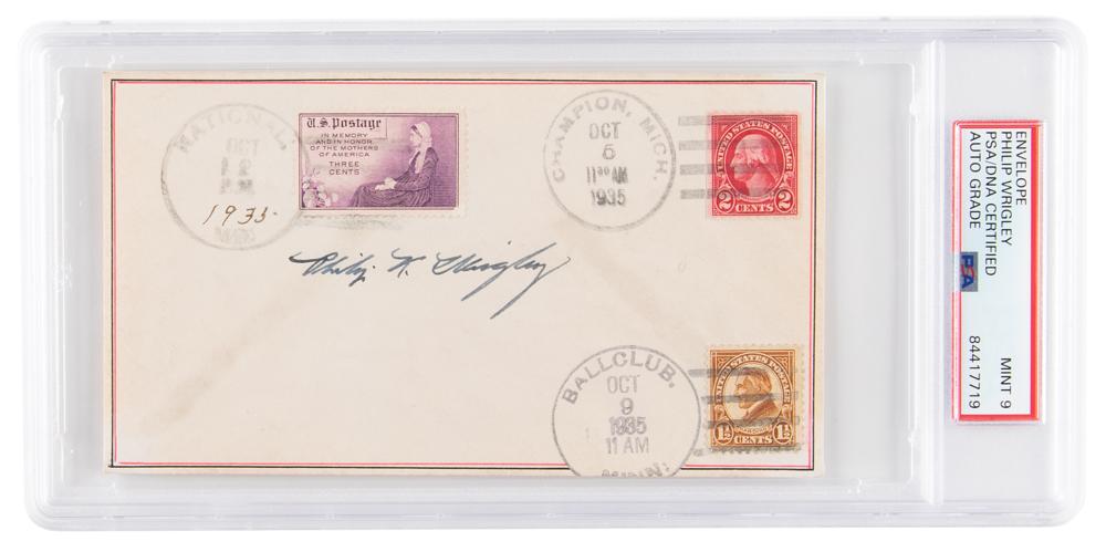 American chewing gum manufacturer and executive in Major League Baseball (1894-1977) who inherited both of those roles as the quiet son of his much more flamboyant father, William Wrigley Jr. Mailing envelope with three postmarks dated to October 1935, with locations reading, “National,” “Champion, Mich.,” and “Ballclub.” Signed neatly in the center in black ink, “Philip K. Wrigley.” In fine condition, with some light diagonal seal-related toning. Encapsulated in a PSA/DNA authentication holder, grading the autograph as "MINT 9."