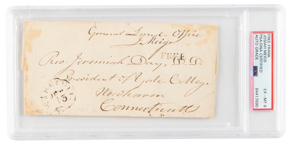 American academic, journalist, and government official (1757-1822) who was the grandfather of Major General Montgomery C. Meigs and served as the first acting president of the University of Georgia in Athens. After his academic career, Meigs was appointed Surveyor-General by President James Madison in 1812, and later accepted an appointment as Commissioner of the United States General Land Office in Washington, D.C., in 1814. During his tenure at the U.S. Land Office, under Thomas Jefferson, he instituted the nation's first system of daily meteorological observations at the land offices throughout the country, which evolved into the National Weather Service. Hand-addressed mailing envelope, 6.5 x 3.25, filled out by Josiah Meigs and postmarked on June 13 [1818], addressed to “Rev. Jeremiah Day, D.D., President of Yale College, Newhaven, Connecticutt,” and franked above, "General Land Office, J. Meigs," who also signs and dates the reverse, "J. Meigs, June 1818." In very good to fine condition, with scattered staining. Encapsulated in a PSA/DNA authentication holder, grading the autograph as "EX-MT 6.”