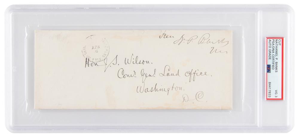 Hand-addressed envelope panel, 8.5 x 3.5, filled out by Nathaniel P. Banks, who addresses the envelope to “Hon. J. S. Wilson, Com’d Gen’l Land Office, Washington, D.C.,” franked in the upper right corner, “Free, N. P. Banks.” In fine condition, with scattered light stains. Encapsulated in a PSA/DNA authentication holder, grading the autograph as "VG 3."