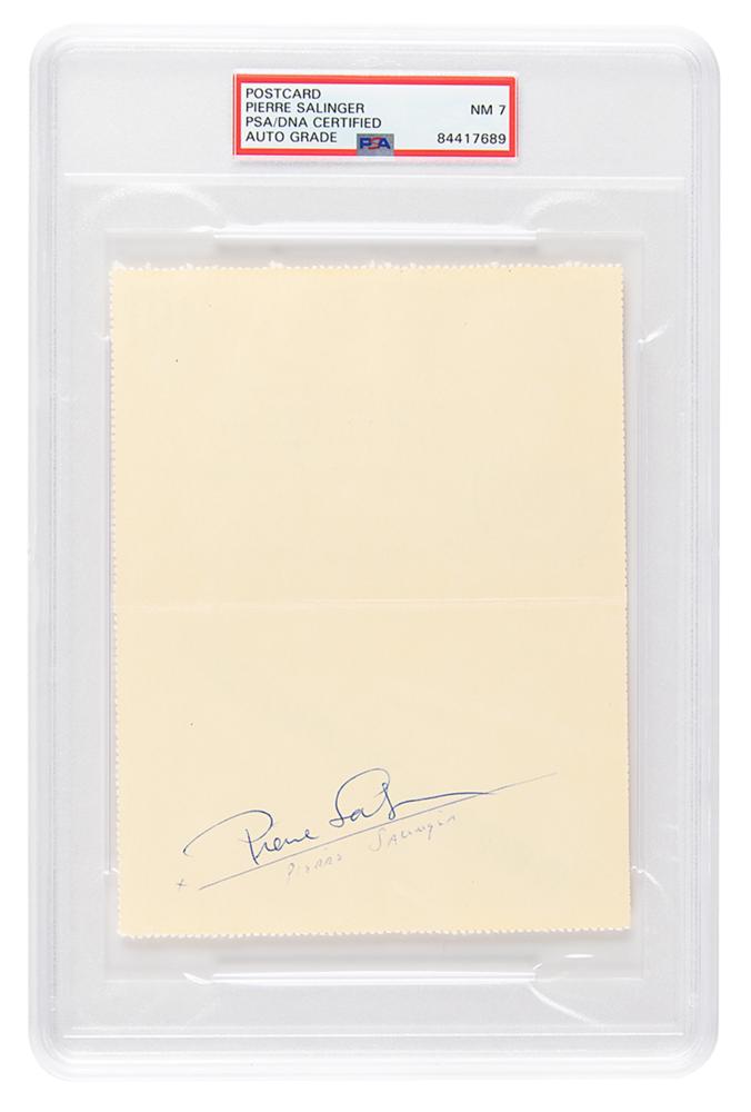 American journalist, author, and politician (1925-2004) who served as the ninth press secretary for United States Presidents John F. Kennedy and Lyndon B. Johnson. Salinger served as a United States Senator in 1964 and as campaign manager for the 1968 Robert F. Kennedy presidential campaign. Ballpoint signature, "Pierre Salinger,” on the inside of a 4.75 x 6.25 Mexican air mail postal card, with typed address field: "Presidential Flight, Washington, D.C. to Mexico City, Mexico, June 29, 1962." In fine condition. Encapsulated in a PSA/DNA authentication holder, grading the autograph as "NM 7."