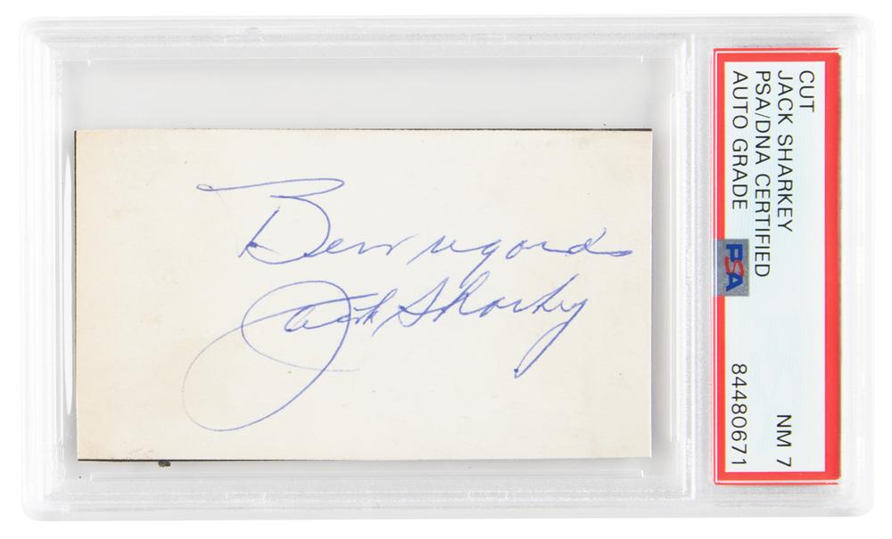 Ballpoint signature, "Best regards, Jack Sharkey,” on an off-white 3.5 x 2 card. In fine condition, with faint edge soiling. Encapsulated in a PSA/DNA authentication holder, grading the autograph as "NM 7."