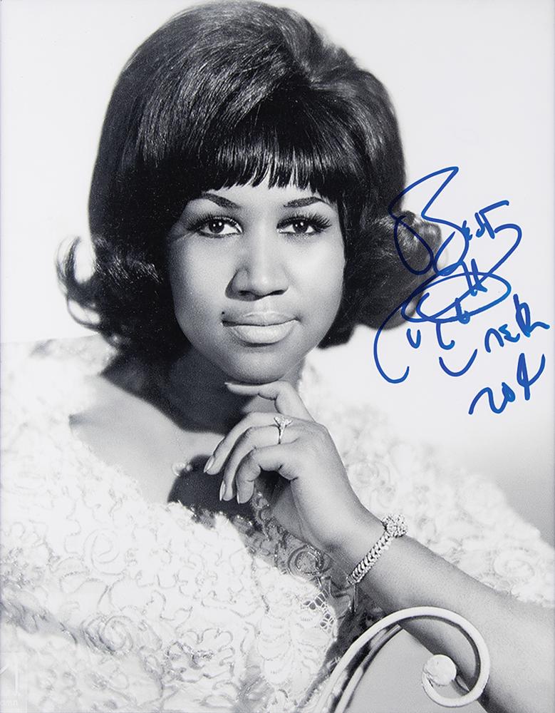 Youthful glossy 10.75 x 13.75 close-up photo of Aretha Franklin, prominently signed in blue felt tip. Archivally matted and framed to an overall size of 16.5 x 19.5. In fine condition, with a small crease to the top edge.