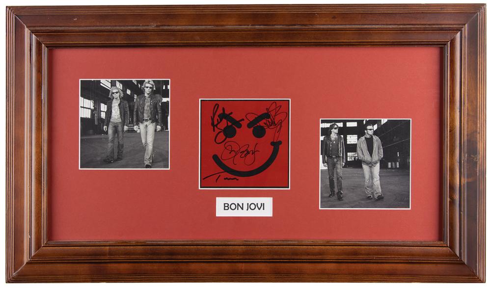 Have A Nice Day CD booklet, signed on the cover in black felt tip by all four members: Jon Bon Jovi, David Bryan, Richie Sambora, and Tico [Torres]. Archivally matted and framed to an overall size of 24 x 14. In fine condition.