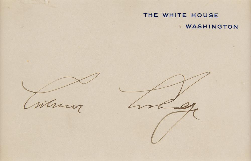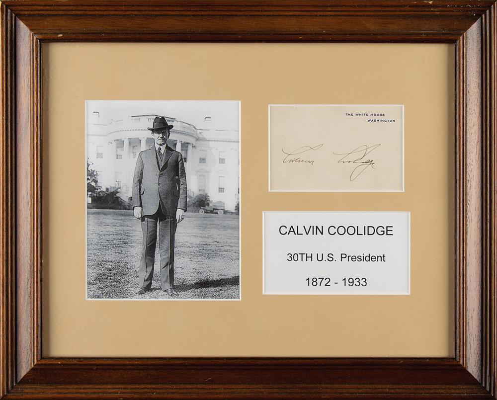 Official White House card, 4 x 2.75, signed neatly in ink by Calvin Coolidge. Matted and framed with a caption and portrait to an overall size of 15.5 x 12.5. In visibly fine condition (not viewed out of the frame).