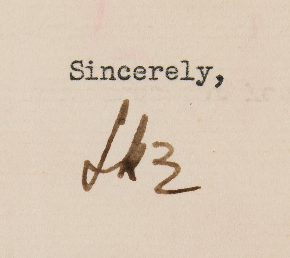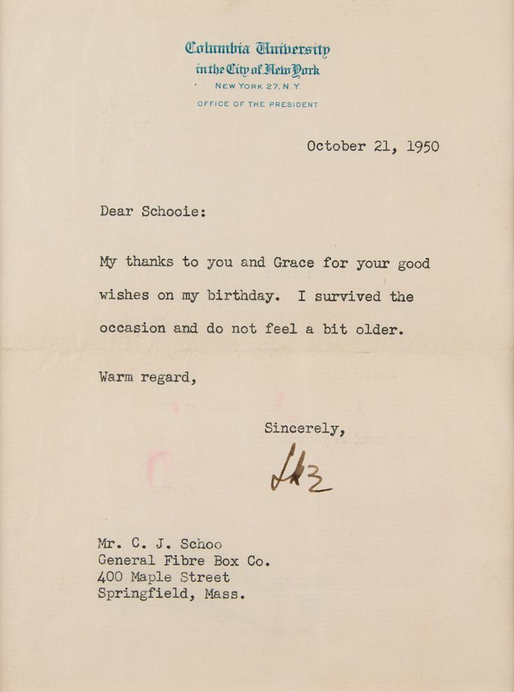 TLS signed "Ike," one page, 5.25 x 7, Columbia University letterhead, October 21, 1950. Letter to Mr. C. J. Schoo, in full: "My thanks to you and Grace for your good wishes on my birthday. I survived the occasion and do not feel a bit older." Archivally matted and framed with a portrait and caption to an overall size of 13.75 x 11. In fine condition, with a few small faint pinks stains. Eisenhower had just celebrated his 60th birthday on October 14, and would soon take a prolonged leave of absence from Columbia beginning in December 1950 to assume responsibilities as the first supreme commander of the North Atlantic Treaty Organization (NATO).