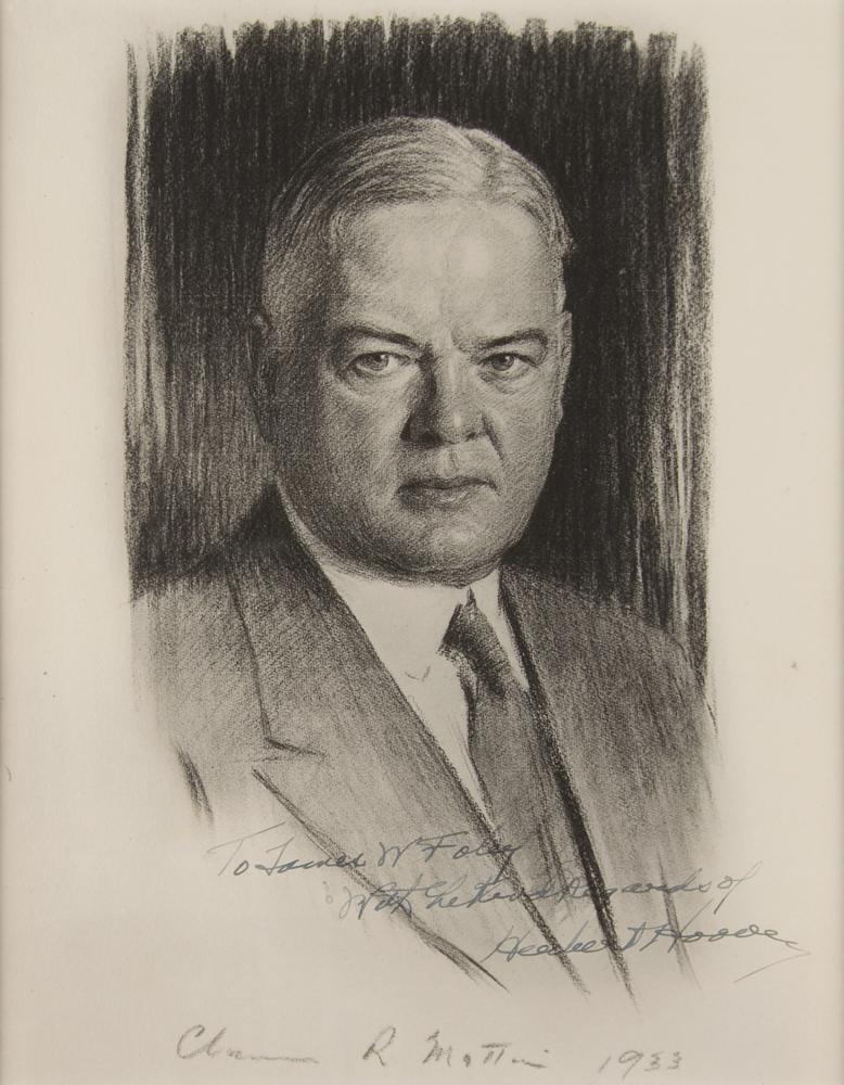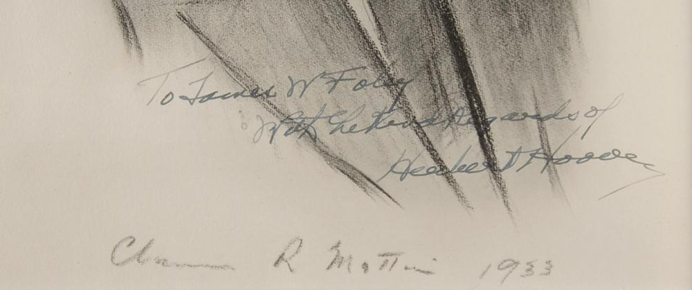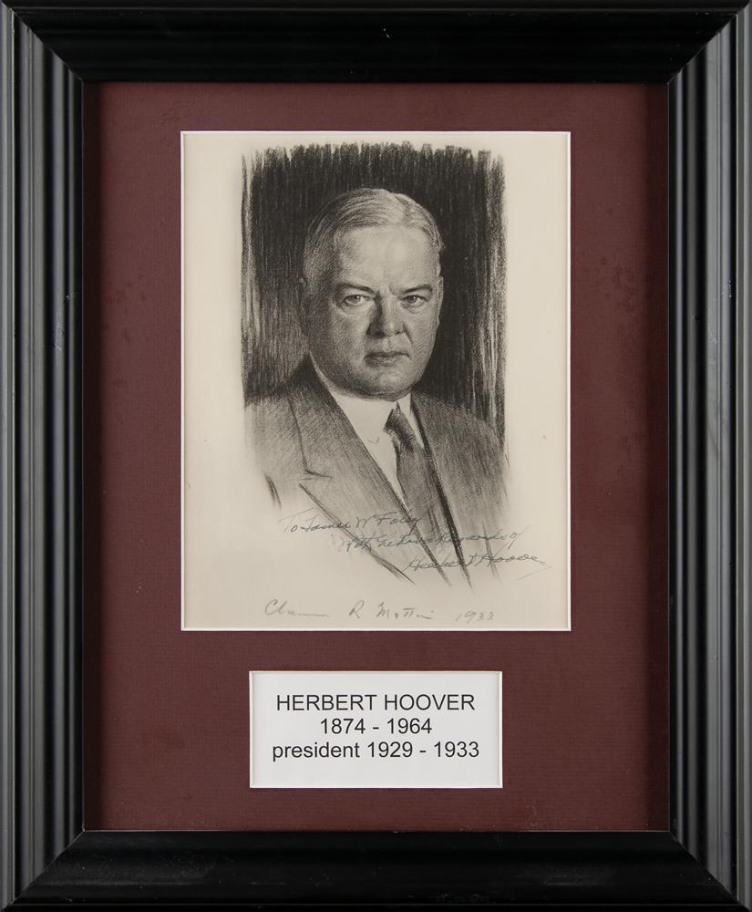 Handsome 7 x 9 print of an artist's sketch of President Hoover, signed and inscribed in fountain pen, "To James W. Foley, With the kind regards of Herbert Hoover." Matted and framed with a caption to an overall size of 13.75 x 17. In fine condition.
