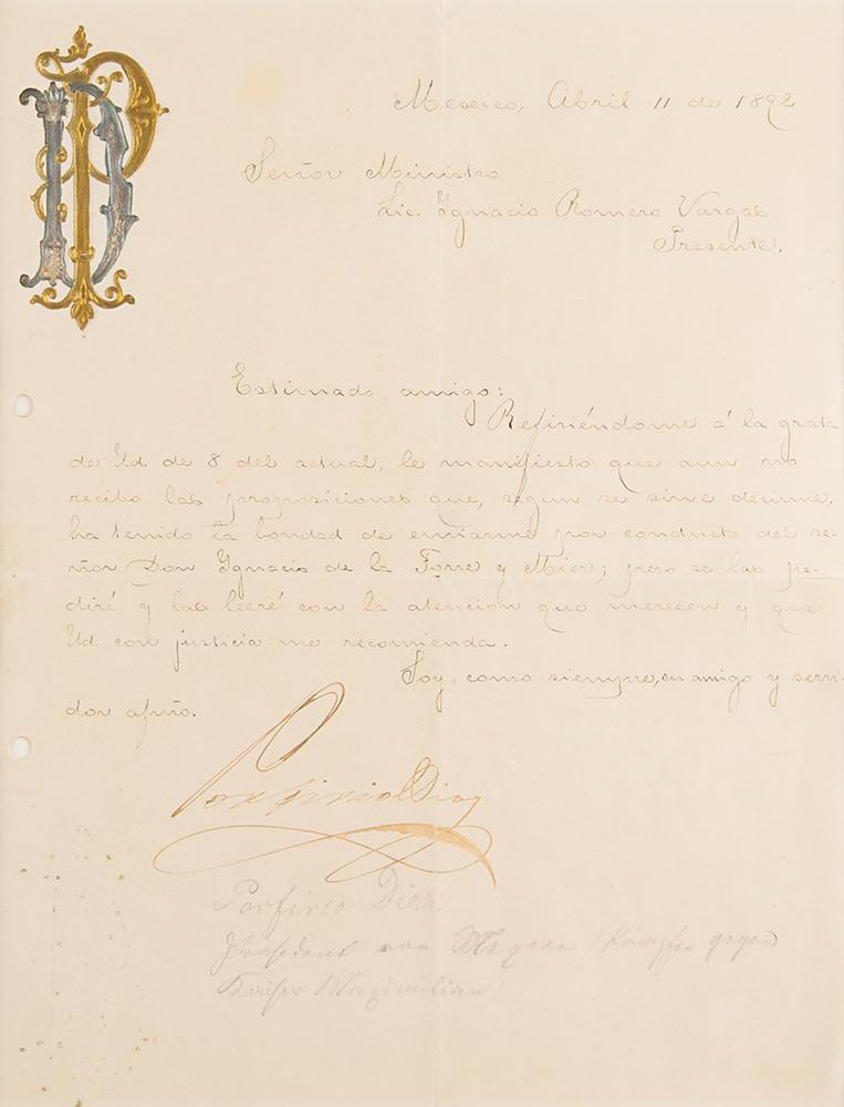 Mexican general and politician (1830-1915) who served seven terms as president of Mexico. LS in Spanish, one page, 8 x 10.5, elaborate personally monogrammed letterhead, April 11, 1892. Untranslated letter to a friend, archivally double-matted and framed with a portrait and caption to an overall size of 20.5 x 16.5. In fine condition, with slight overall fading, and two file holes to the left edge.