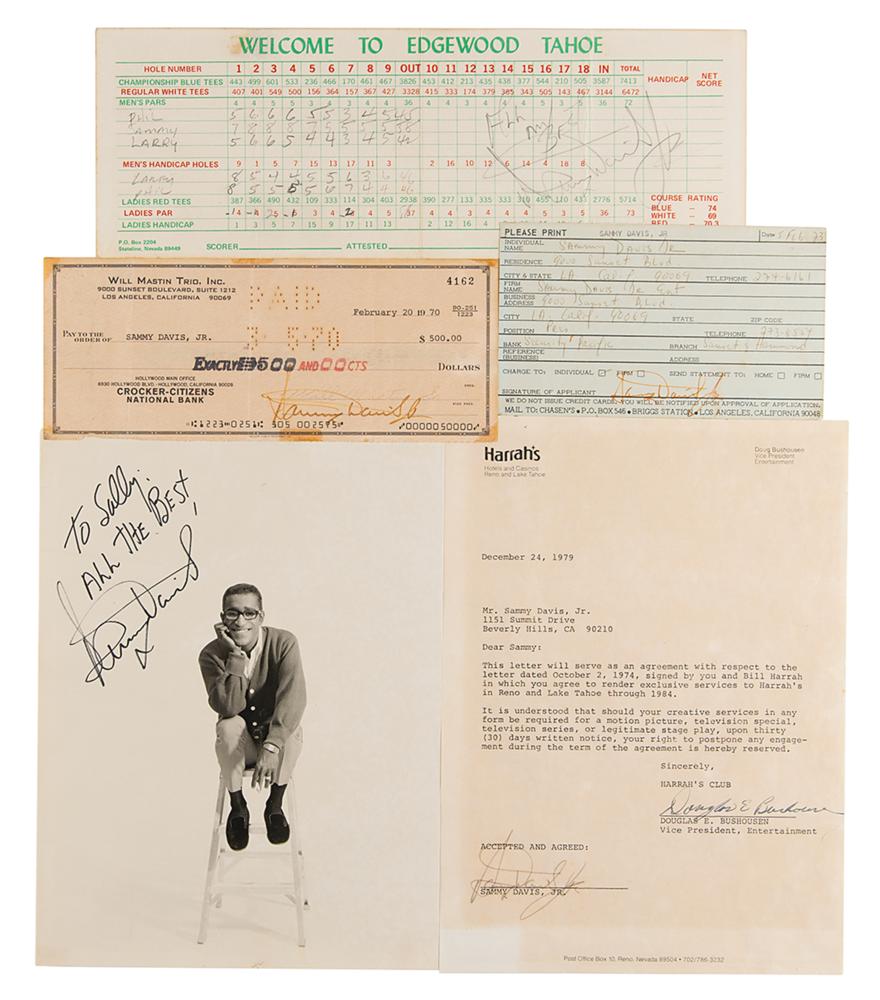 Five items signed by Sammy Davis, Jr., including: a matte-finish 7.5 x 10 photo of him sitting on a stool, signed and inscribed in black felt tip, "To Sally, All the Best, Sammy Davis"; a 1973 Chasen's restaurant credit information card, signed in felt tip; a golf score card from Edgewood Tahoe for a match between "Phil," "Sammy," and "Larry," signed in pencil, "All my Best, Sammy Davis, Jr."; a contract between Davis and Harrah's in Reno and Lake Tahoe from 1979, signed in felt tip; and a twice-signed Will Mastin Trio business check, made payable to Davis for $500, February 20, 1970, signed on the front and endorsed on the reverse by Davis. In overall very good to fine condition, with light overall fading from prior display, tape to edges of some items, and trimmed edges to the photo and contract.