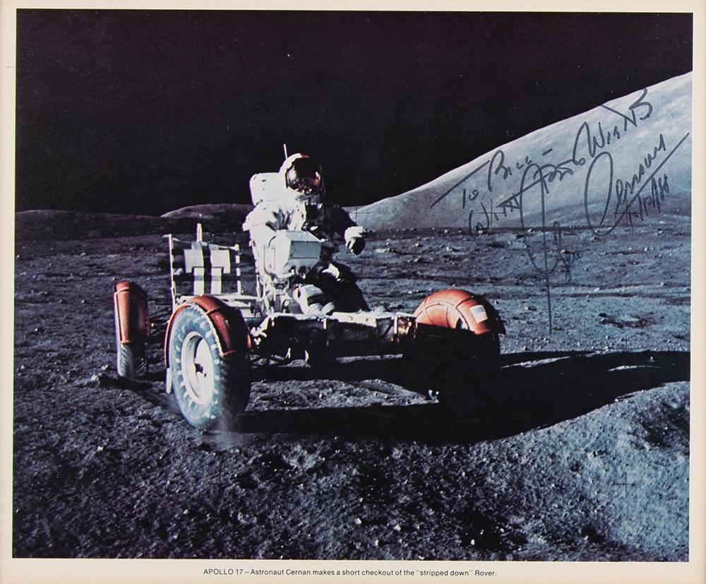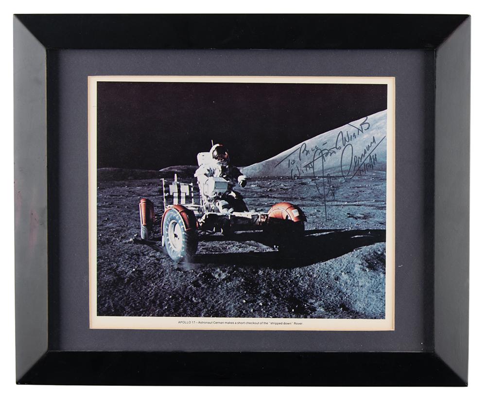 Official color 10.75 x 8.75 NASA lithograph of Gene Cernan seated in the lunar rover during the Apollo 17 mission, signed and inscribed in black felt tip, "To Bill—with best wishes, Gene Cernan, 1/12/8.” Matted and framed to an overall size of 16.25 x 13.25. In fine condition.