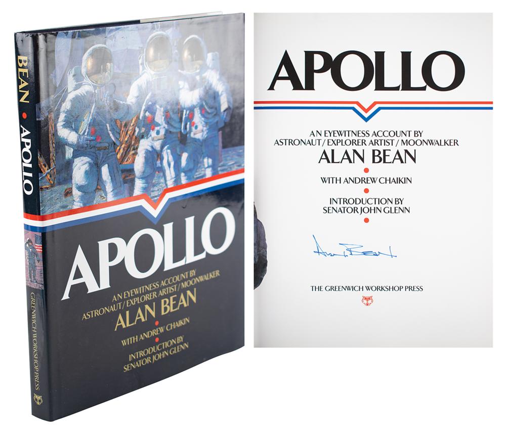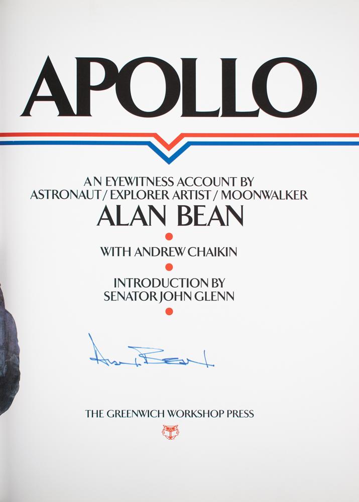 Signed book: Apollo: An Eyewitness Account. First edition, first printing. Shelton, CT: The Greenwich Workshop Press, 1998. Hardcover with dust jacket, 9.5 x 12.25, 176 pages. Signed on the title page in blue felt tip by Alan Bean. In fine condition.