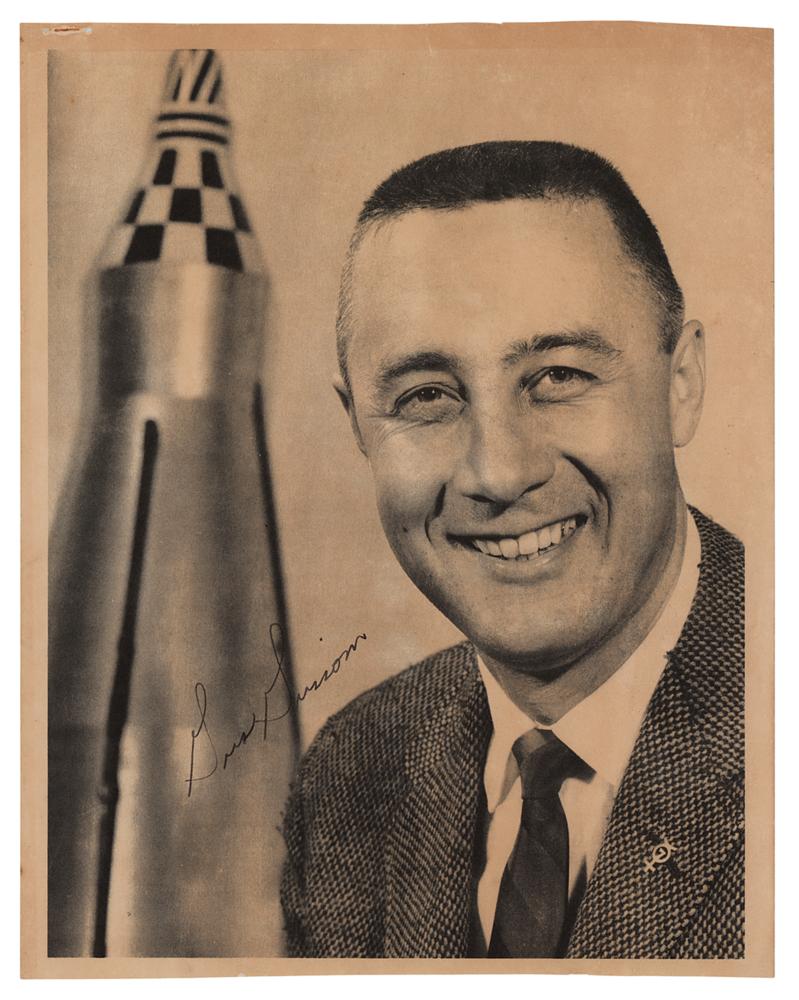 Paperstock photo of Gus Grissom posing in front of a large rocket model, 8 x 10, signed in black ink. In fine condition, with trimmed borders, a small tear to top edge, and staple holes to the upper left corner.