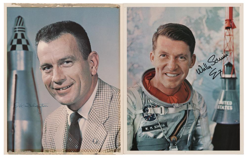 Two official color 8 x 10 NASA lithographs, one of Wally Schirra in his Mercury space suit and the other of Deke Slayton in front of a rocket model, individually signed in black felt tip, "Wally Schirra," who adds a Sigma 7 symbol, and in blue ballpoint, "DK Slayton." In overall very good to fine condition, with three tack holes in the borders of the Schirra photo, and old tape residue in the top and bottom borders of the Slayton photo.