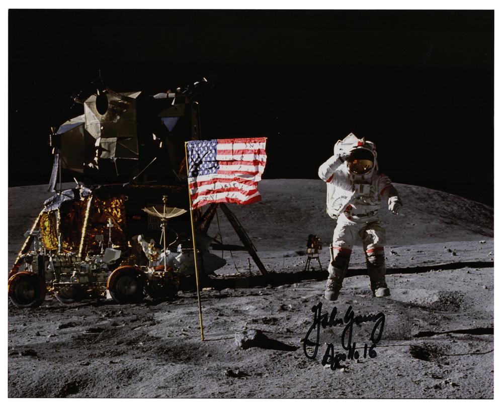 Color satin-finish 10 x 8 photo of Young leaping off the lunar surface and saluting the American flag, signed in black felt tip, "John Young, Apollo 16." Reverse bears an affixed certificate of authenticity from Novaspace. In fine condition.