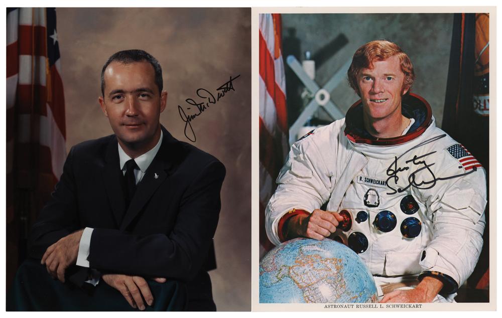 Two photos signed in black felt tip by the pictured Apollo 9 astronaut: a color semi-glossy 8 x 10 photo of Jim McDivitt, and an official color 8 x 10 NASA lithograph of Rusty Schweickart in his white space suit. In overall fine condition, with light yellow haloing to Schweickart's signature.