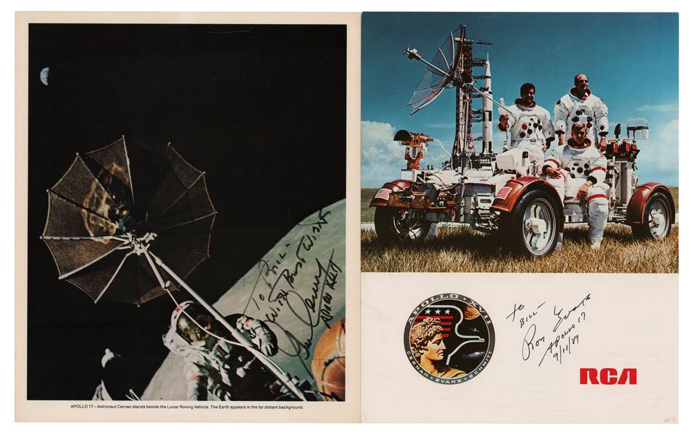 Two photos: an oversized color 9.25 x 11 lithograph of CDR Cernan standing behind the lunar rover during the Apollo 17 mission, signed and inscribed in black felt tip, “To Bill—with best wishes, Gene Cernan, Apollo XVII”; and a color 8.5 x 11 RCA promotional photo of the Apollo 17 crew posing with the lunar rover, signed and inscribed in thin black felt tip, “To Bill—Ron Evans, Apollo 17, 9/11/89.” In overall fine condition, with some light creasing to Evans.