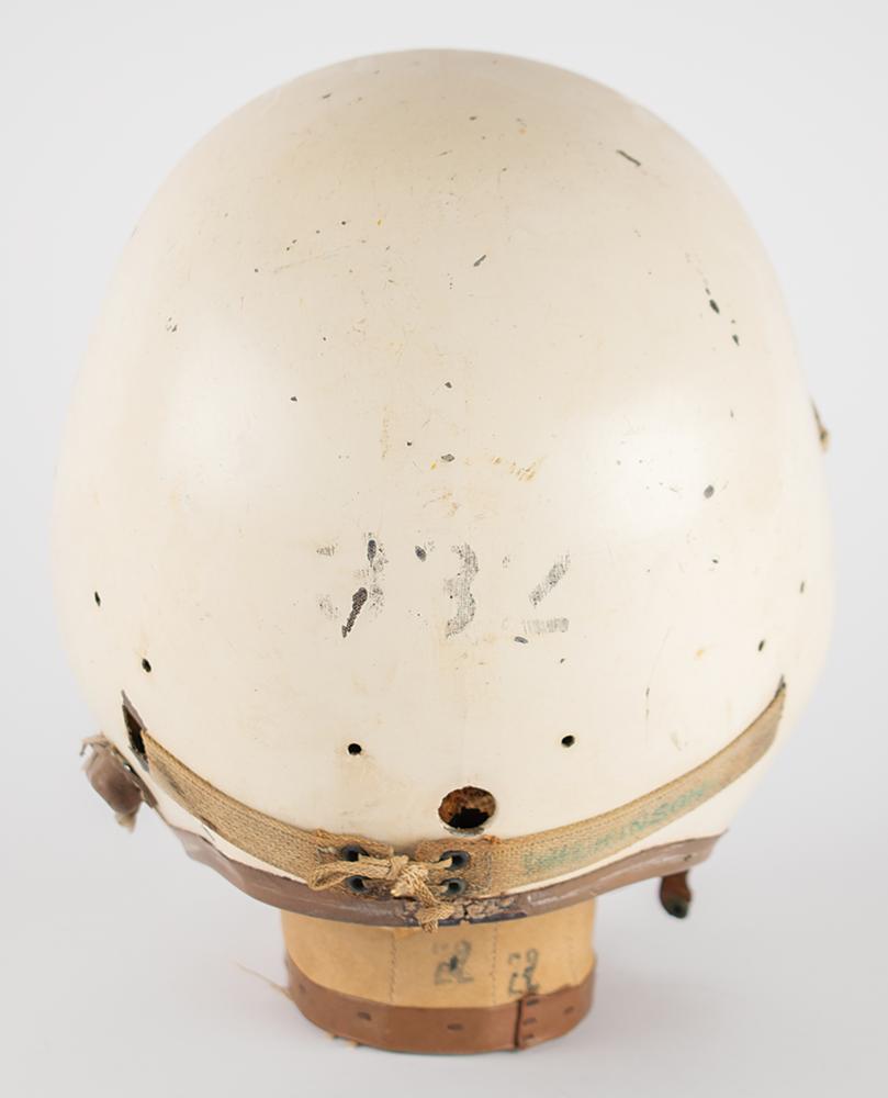 United States Air Force Type P-1A protective flying helmet, 8.5 x 9 x 9, consisting of an off-white fiberglass shell with the front bearing the emblem of the United States Army Air Forces, the back of the helmet stenciled “332,” and the cloth strap to the reverse annotated “Wilkinson.” A very faded USAAF emblem is also present to the interior leather strap webbing. In very good to fine condition, with obvious signs of wear and use, including notable disintegration to interior leather and foam padding. This was the first type of hard helmet mass-produced for standard issue to the United States Air Force jet crewmen to provide buffeting and crash protection. The original P-1 was introduced in March 1948. The P-1A was identical except for a neck strap, which was added to prevent the helmet from tilting up during maneuvers.