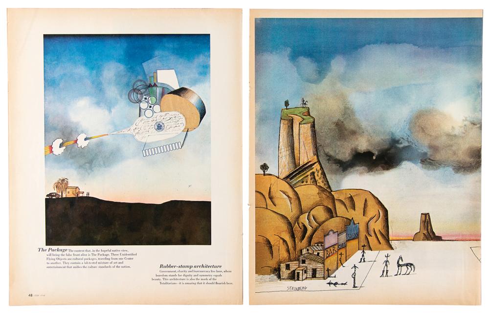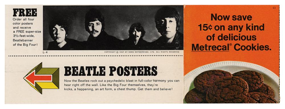 Original pair of color 30.75 x 13.25 fold-out posters removed from the January 9, 1968 issue of Look magazine, containing Richard Avedon’s classic psychedelic portraits of the Beatles; the page 45 fold-out features George Harrison, Ringo Starr, and a Richard Kostelanetz article, and the page 48 fold-out depicts John Lennon, Paul McCartney, and a Saul Steinberg article. The reverse of both features Avedon’s more formal black-and-white panoramic portraits of the band. In overall fine condition, with light handling wear, including some creases and very small edge tears. Accompanied by the original NEMS Enterprises advertisement and order form.