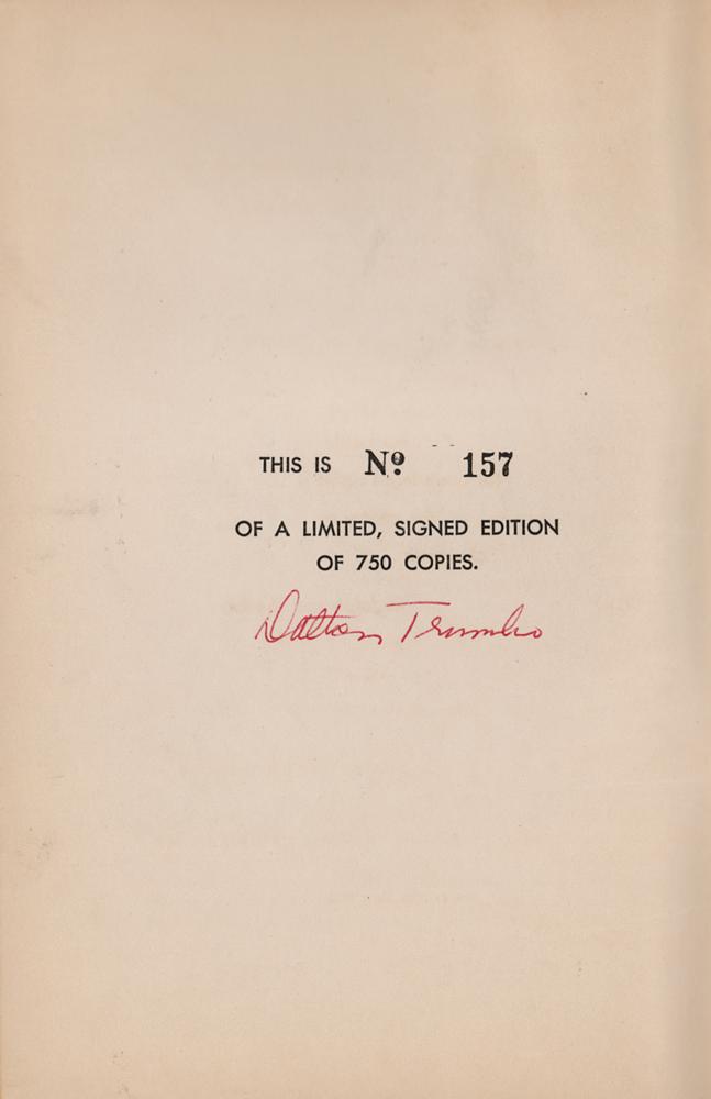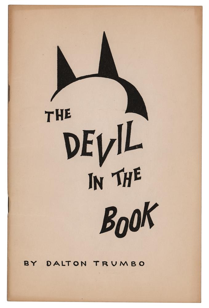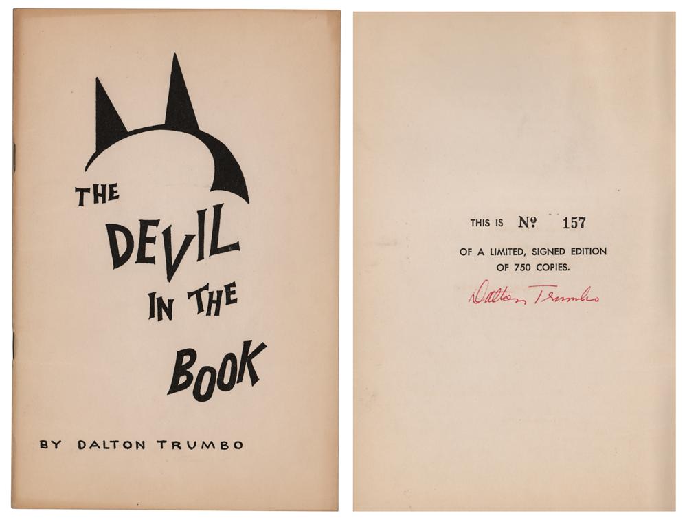 Academy Award-winning screenwriter (1905-1976) of such films as Spartacus, Exodus, and Papillon who attained worldwide notoriety as a member of the blacklisted 'Hollywood Ten.' Signed limited edition booklet: The Devil in the Book. First edition, limited issue, numbered 157/750. Los Angeles: California Emergency Defense Committee, 1956. Softcover, 5.5 x 8.25, 42 pages. Signed inside the front wrapper in red ballpoint, "Dalton Trumbo." In fine condition, with light edge toning to the covers.
