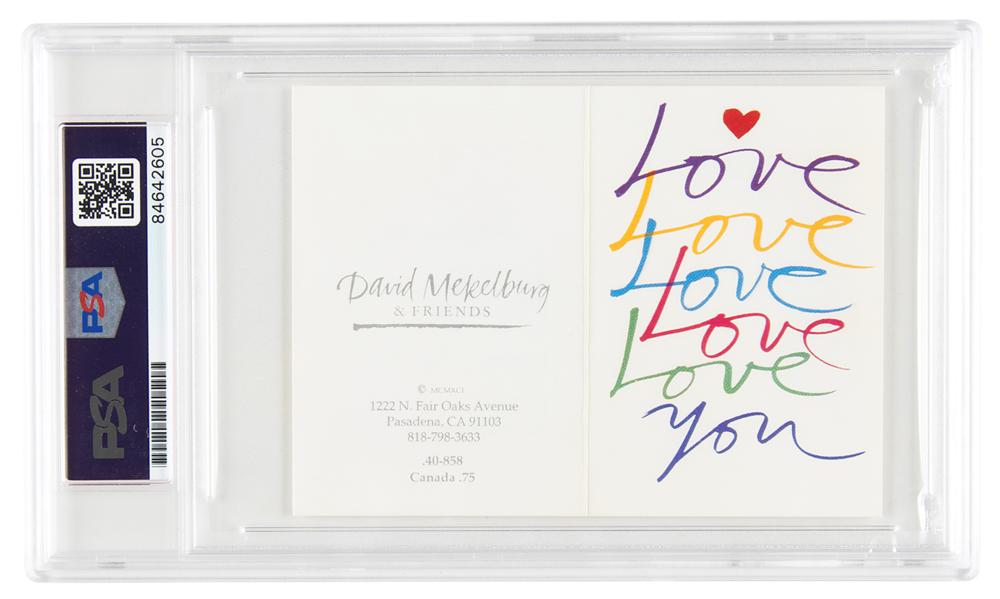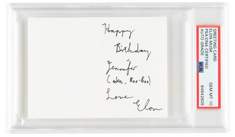 Small birthday card with a multicolored, repeating 'Love You' design on the front, measures 4.5 x 3.25 open, neatly signed and inscribed inside in black ink, “Happy Birthday, Jennifer (aka, Boo-Boo), Love, Elon.” In very fine condition. Encapsulated in a PSA/DNA authentication holder, grading the autograph as "GEM MT 10."