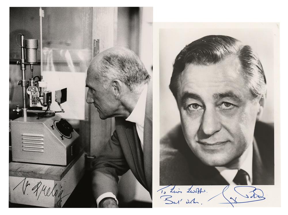 Two photos signed by winners of the Nobel Prize in Chemistry: a glossy 5 x 7 photo of Vladimir Prelog, noted for his research into the stereochemistry of organic molecules and reactions, signed in black ink, "V. Prelog"; and a matte-finish 4.5 x 6.5 photo of George Porter, known for his study of 'extremely fast chemical reactions, effected by disturbing the equilibrium by means of very short pulses of energy,' signed and inscribed in the lower border in blue ink. In overall fine condition. Accompanied by the original mailing envelope for the Prelog.