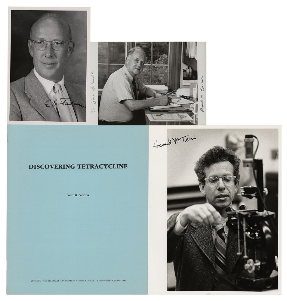 Four items signed by important medical researchers, including two Nobel Prize winners. Includes: a glossy 5 x 7 head-and-shoulders photo of geneticist Edward L. Tatum, who shared the 1958 Nobel Prize in Physiology or Medicine for showing that genes control individual steps in metabolism, signed in fountain pen; a glossy 8 x 10 photo of geneticist Howard M. Temin, who shared the 1975 Nobel Prize in Physiology or Medicine for his discovery of reverse transcriptase, signed in black felt tip; and a booklet entitled "Discovering Tetracycline" and a glossy 7 x 5 photo of Lloyd H. Conover, inventor of the antibiotic tetracycline, both signed in black ballpoint by Conover (with the photo inscribed). In overall fine condition. Accompanied by an unsigned photo of Tatum.