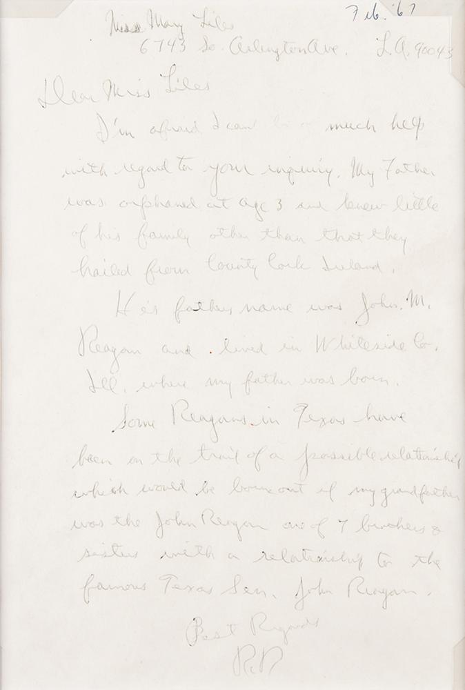 ALS signed “R. R.,” one page, 5.75 x 8.5, [February 1967]. Handwritten letter to Miss May Liles, in full: “I’m afraid I can’t be of much help with regard to your inquiry. My Father was orphaned at age 3 and knew little of his family other than that they hailed from County Cork Ireland. His father’s name was John M. Reagan and lived in Whiteside Co. Ill. where my father was born. Some Reagans in Texas have been on the trail of a possible relationship which would be borne out if my grandfather was the John Reagan one of 7 brothers & sisters with a relationship to the famous Texas Sen. John Reagan.” Matted with a portrait to an overall size of 15.5 x 13. In very good to fine condition, with overall fading, and small words ("be of") very light.