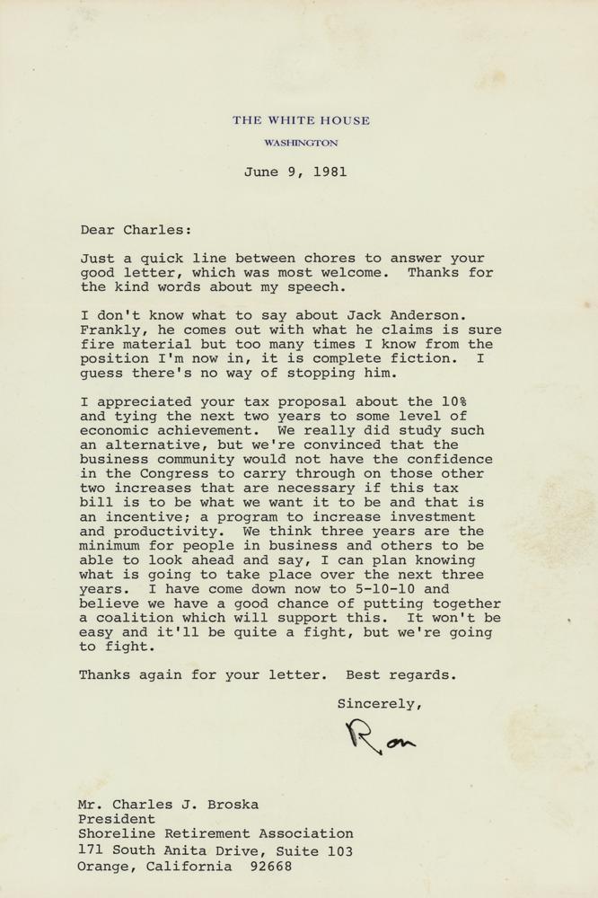 TLS as president, signed “Ron,” one page, 7 x 10.5, White House letterhead, June 9, 1981. Letter to Charles J. Broska, president of the Shoreline Retirement Association, in full: "Just a quick line between chores to answer your good letter, which was most welcome. Thanks for the kind words about my speech. I don’t know what to say about Jack Anderson. Frankly, he comes out with what he claims is sure fire material but too many times I know from the position I’m now in, it is complete fiction. I guess there’s no way of stopping him. I appreciated your tax proposal about the 10% and tying the next two years to some level of economic achievement. We really did study such an alternative, but we’re convinced that the business community would not have the confidence in the Congress to carry through on those other two increases that are necessary if this tax bill is to be what we want it to be and that is an incentive; a program to increase investment and productivity. We think three years are the minimum for people in business and others to be able to look ahead and say, I can plan knowing what is going to take place over the next three years. I have come down now to 5-10-10 and believe we have a good chance of putting together a coalition which will support this. It won’t be easy and it’ll be quite a fight, but we’re going to fight. Thanks again for your letter. Best regards.” In fine condition.