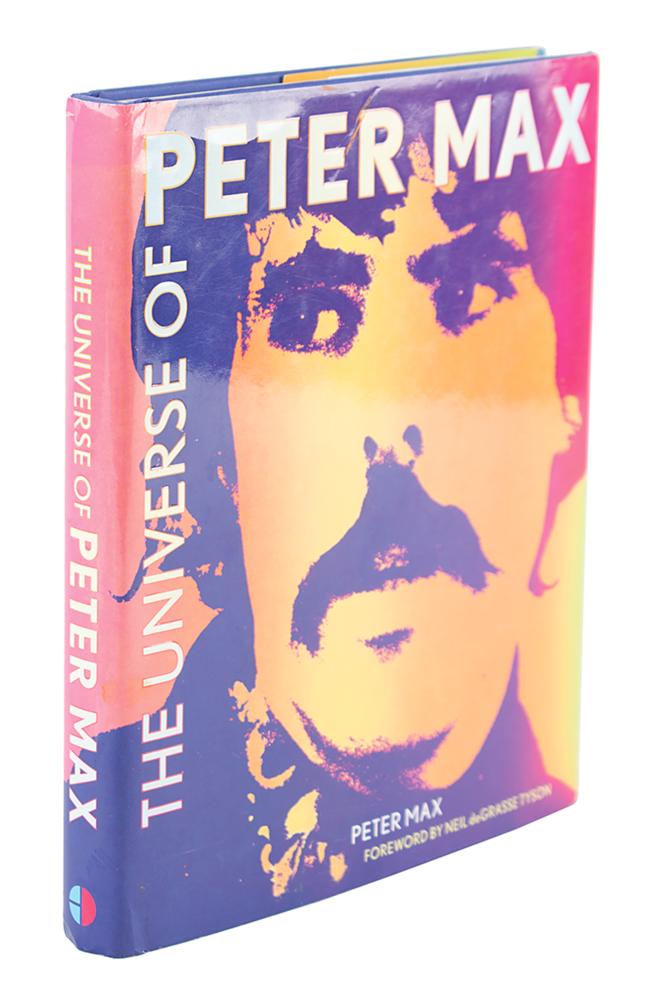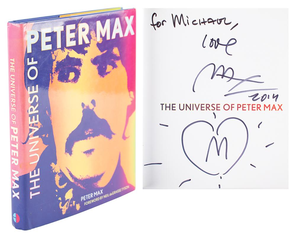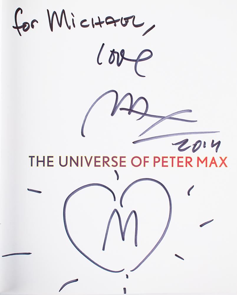 Signed book: The Universe of Peter Max. First edition. NY: Harper Design, 2013. Hardcover with dust jacket, 7.25 x 8.75, 288 pages. Signed and inscribed on the half-title page in black felt tip, "For Michael, love Max, 2014," adding a sketch of a heart. In fine condition.
