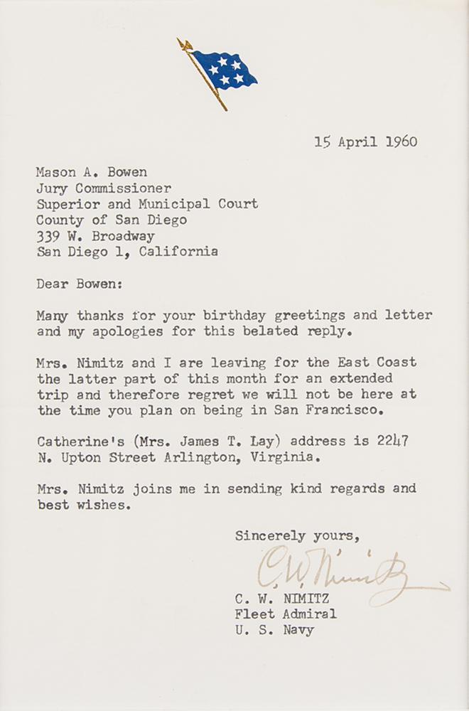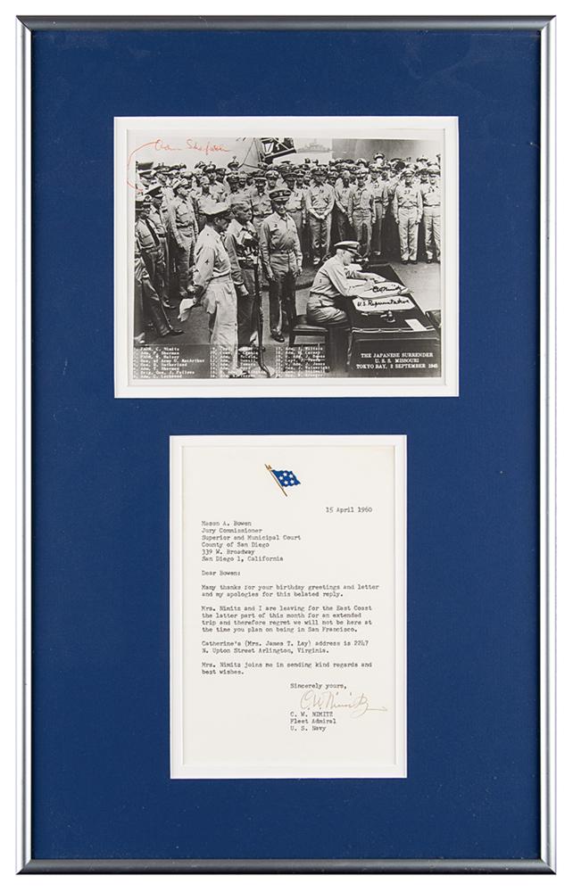 TLS signed “C. W. Nimitz,” one page, 5 x 7.5, Five Star Fleet Admiral letterhead, April 15, 1960. Letter to Mason A. Bowen, in part: "Many thanks for your birthday greetings and letter and my apologies for this belated reply. Mrs. Nimitz and I are leaving for the East Coast the latter part of this month for an extended trip and therefore regret we will not be here at the time you plan on being in San Francisco." Attractively double-matted and framed with a photo of the Japanese surrender on the USS Missouri (bearing a pre-printed signature) to an overall size of 12.75 x 20.5. In fine condition.