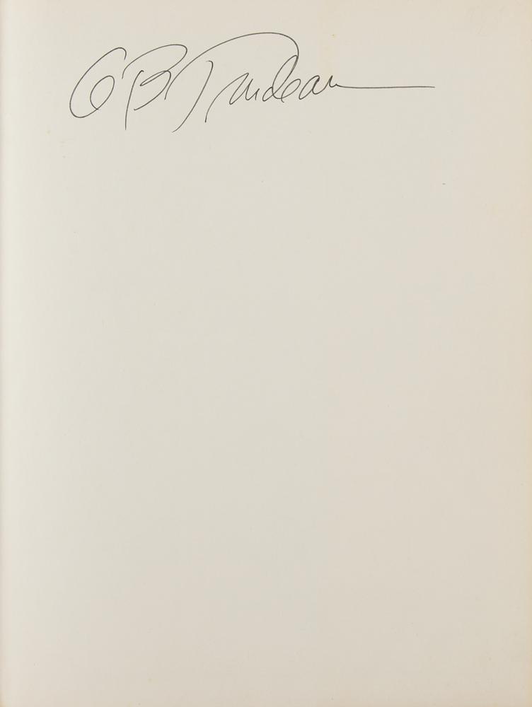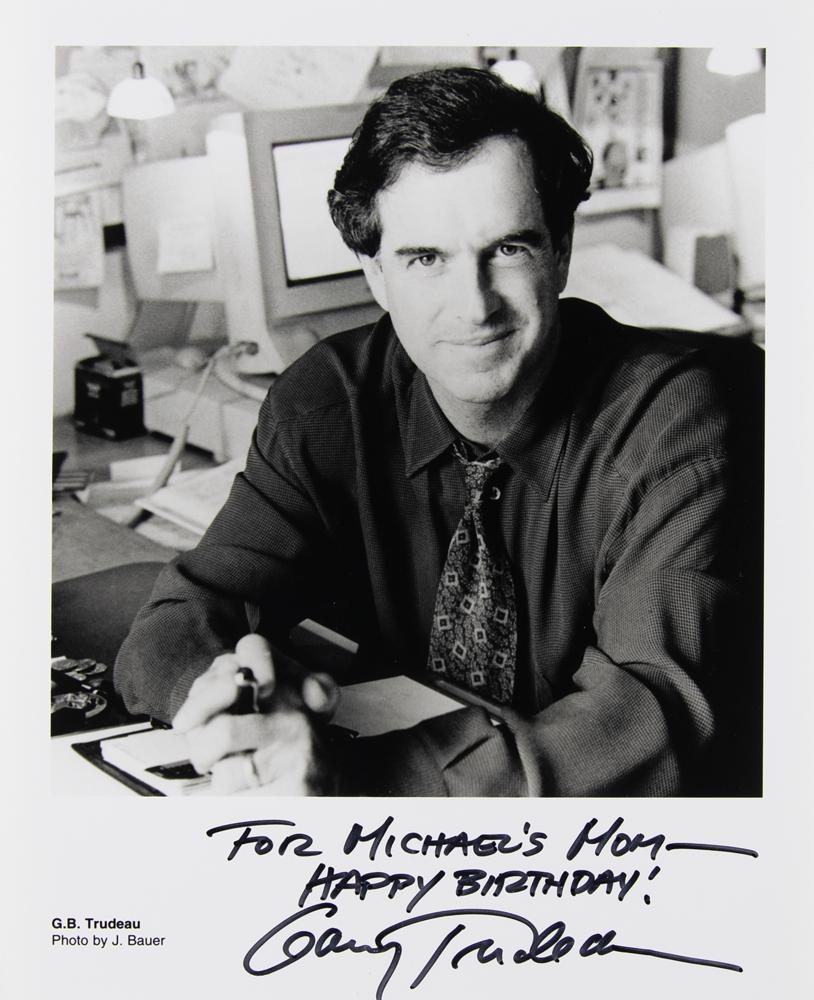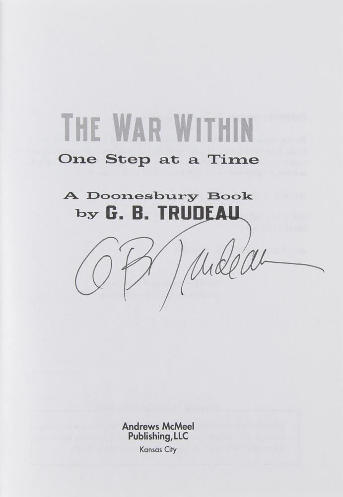 Four items signed by American cartoonist Garry Trudeau, creator of Doonesbury: a satin-finish 8 x 10 portrait, signed and inscribed in the lower border in black felt tip; a softcover first edition of The War Within, signed on the title page in black ink; a softcover first edition of Dude: The Big Book of Zonker, signed on the half-title page in black ink; and a hardcover edition of A Doonesbury Special, signed on the first free end page in black ink. In overall fine condition. In fine condition.