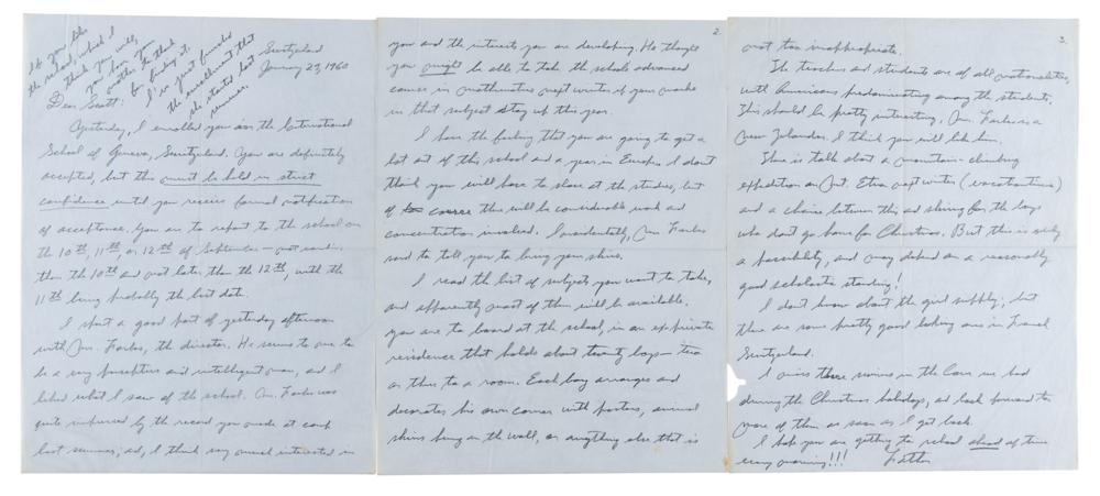ALS, in pencil, signed "Father," three onionskin pages, 8.25 x 10.75, January 29, 1960. Handwritten letter from Switzerland to his son. In part: "Yesterday, I enrolled you in the International School of Geneva, Switzerland. You are definitely accepted, but this must be held in strict confidence until you receive formal notification of acceptance. You are to report to the school on the 10th, 11th, or 12th of September—not earlier than the 10th and not later than the 12th, with the 11th being probably the best date?Mr. Forbes was quite impressed by the record you made at camp last summer, and, I think very much interested in you and the interests you are developing. He thought you might be able to take the school's advanced course in mathematics next winter if your marks in that subject stay up this year. I have the feeling that you are going to get a lot out of this school and a year in Europe. I don't think you will have to slave at the studies, but of course there will be considerable work and concentration involved & incidentally, Mr. Forbes said to tell you to bring your skis?I read the list of subjects you want to take and apparently most of them will be available. You are to board at the school, in an ex-private residence that holds about twenty boys—two or three to a room. Each boy arranges and decorates his own corner with posters, animal skins hung on the wall, or anything else that is not too inappropriate?There is talk about a mountain-climbing expedition on Mt. Etna next winter (vacation time) and a choice between this and skiing for boys who don't go home for Christmas. But this is only a possibility, and may depend on a reasonably good scholastic standing! I don't know about the girl supply; but there are some pretty good looking ones in French Switzerland." Lindbergh adds another notation on the first page, "If you like the school, which I think you will, you have your mother to thank for finding it. I've just finished the enrollment that she started last summer." In fine condition, with light creasing, a paperclip impression to the upper left corner, and minor edge loss to the last page. A seldom-seen side of Lindbergh as father rather than as aviator.