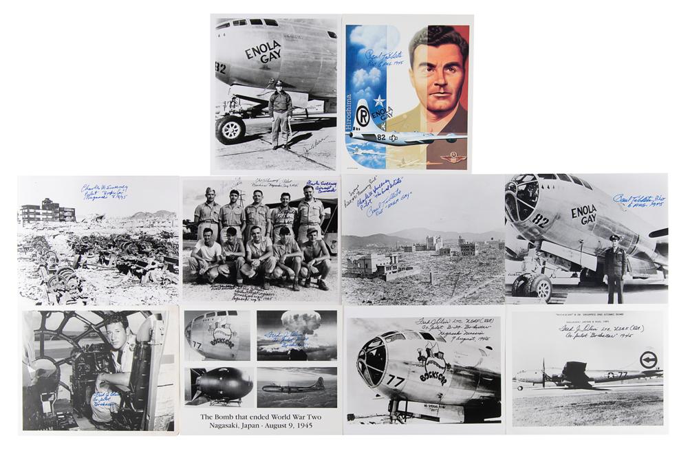 Collection of 36 items signed by one or more crew members of the Enola Gay or Bockscar, the Boeing B-29 Superfortress bombers that dropped atomic bombs on the Japanese cities of Hiroshima and Nagasaki on August 6 and 9, 1945. The collection also includes autographs from other mission-related figures and crew members from participating aircraft Necessary Evil, The Great Artiste, and Straight Flush.