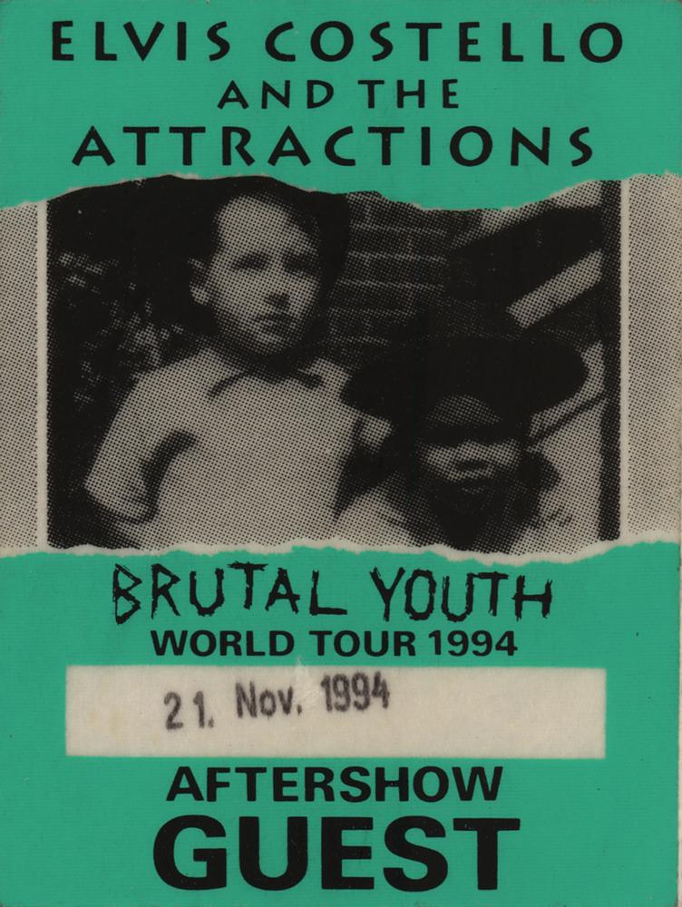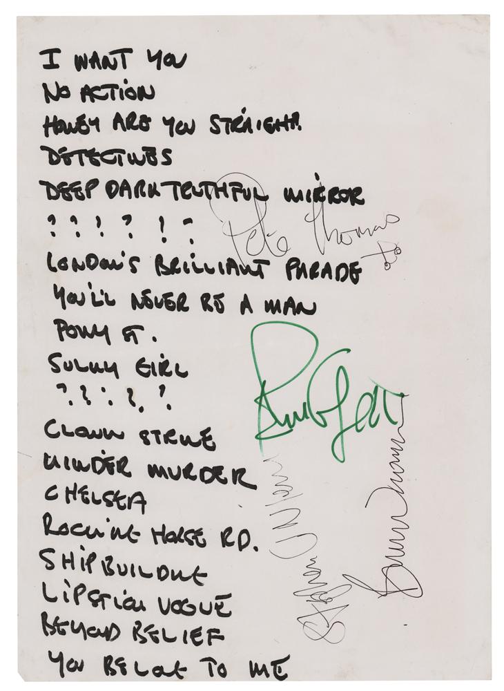 Handwritten set list for an Elvis Costello and the Attractions concert held at Colston Hall in Bristol, England, on November 21, 1994, 8.25 x 11.5, signed in green felt tip by Costello, and in black ink by Steve Nieve, Bruce Thomas, and Pete Thomas. Includes an unused ‘Aftershow Guest’ pass for the concert, which was part of the band’s Brutal Youth 1994 World Tour. In fine condition.