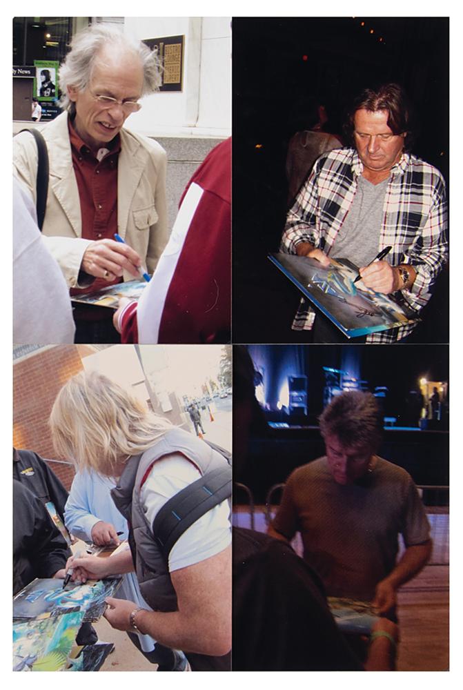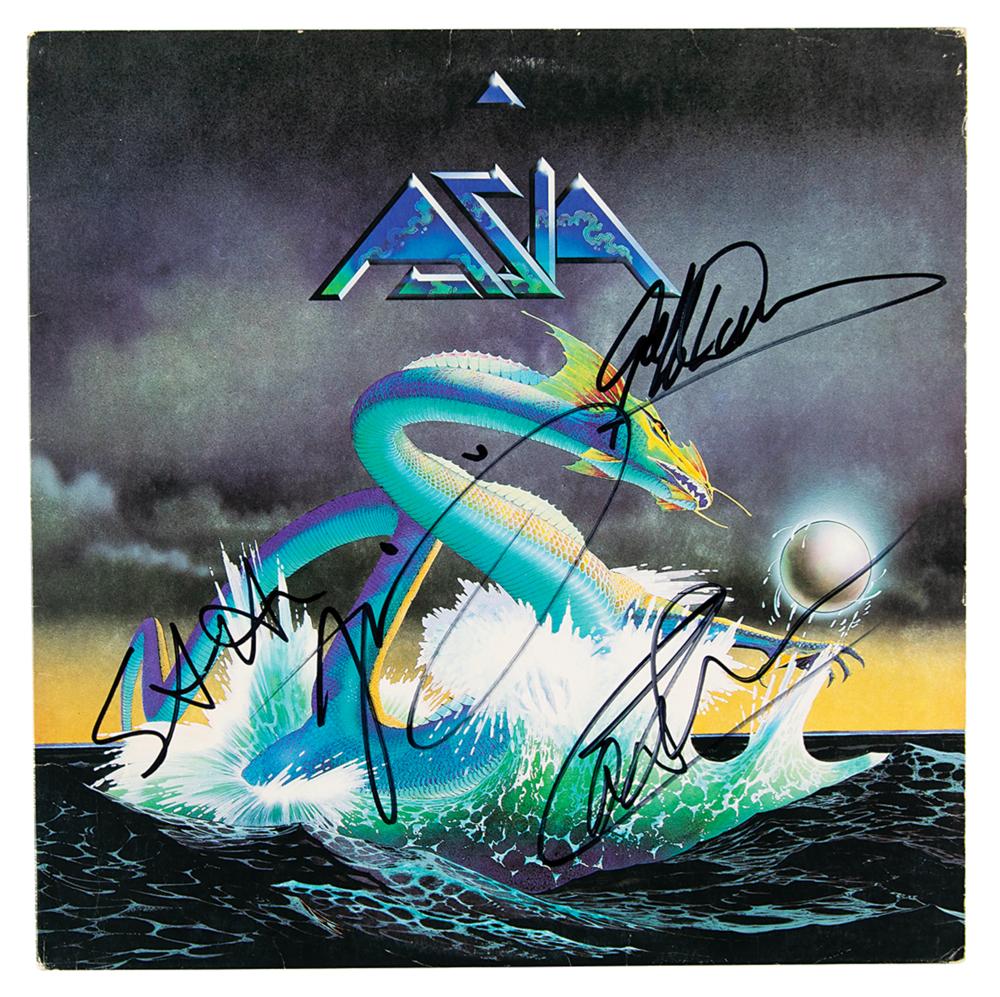 Self-titled debut album by Asia, signed on the front cover in black felt tip by John Wetton, Carl Palmer, Geoff Downes, and Steve Howe. In fine condition. The record is not included. Accompanied by photos of each band member taken at the time of their individual signings.